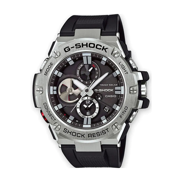 Con una imponente caja plateada gris de 54 mm y una correa de resina negra, este reloj deportivo está diseñado para quienes valoran la presencia y la fiabilidad, ofreciendo el movimiento de Casio y resistencia al agua para buceo de 200 m bajo un cristal mineral para cada aventura acuática.