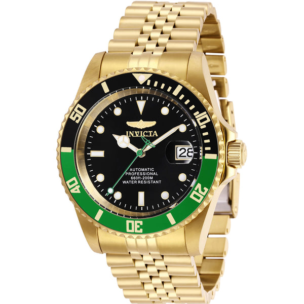 Enciende tu ambición con el Invicta Pro Diver, un símbolo de confianza inquebrantable para el hombre moderno. Su audaz diseño en oro amarillo y negro impone respeto, encarnando una sofisticación casual que te distingue. Mira a través de su fondo de caja transparente, revelando la intrincada danza de su movimiento automático, un latido de precisión. Esto no es solo un reloj, es un testimonio de tu espíritu intrépido. Imagínate viviendo cada momento, desde aventuras audaces hasta reflexiones serenas, con esta poderosa declaración en tu muñeca.