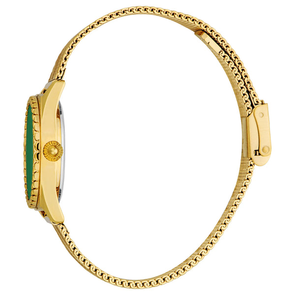 En el ámbito de la moda, donde la elegancia se encuentra con la audacia, surge un reloj que captura la esencia de la sofisticación y la valentía. Elaborado en el corazón del estilo, este Just Cavalli Watch de la ilustre colección Animalier es un testimonio del talento de la marca por lo extraordinario. La caja redonda, bañada en un lujoso tono de oro amarillo, irradia una sensación de opulencia, complementando perfectamente el diseño refinado que define este exquisito accesorio. Con un diámetro de caja de 30 mm, se posa con gracia en la muñeca, una declaración sutil pero impactante de pensamiento vanguardista en moda. La esfera verde botella, que recuerda a bosques profundos y frondosos, añade un toque de misterio y atractivo, capturando la mirada con su profundidad cautivadora. Encerrada en cristal mineral, la esfera está protegida, asegurando claridad y durabilidad. La correa de acero inoxidable, también en oro amarillo, se envuelve alrededor de la muñeca con un cierre deslizante ajustable, ofreciendo tanto comodidad como seguridad. Este reloj no es solo un cronómetro, es un símbolo de gracia y fortaleza femenina, impulsado por un movimiento de cuarzo preciso y con una clásica visualización de 3 manecillas. Resistente al agua, está listo para acompañarte en las aventuras de la vida, un recordatorio constante del espíritu audaz que llevas dentro.