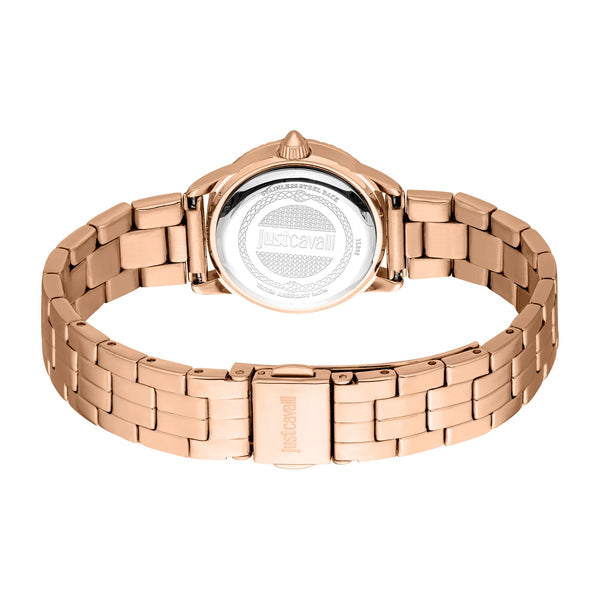El Just Cavalli Mini Raffinata en oro rosa es una visión de elegancia. Su caja redonda y esfera azul claro ofrecen una estética serena, mientras que la correa de acero inoxidable y el cierre desplegable plegable proporcionan un equilibrio perfecto entre sofisticación y modernidad.