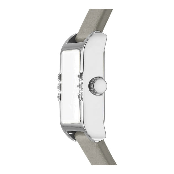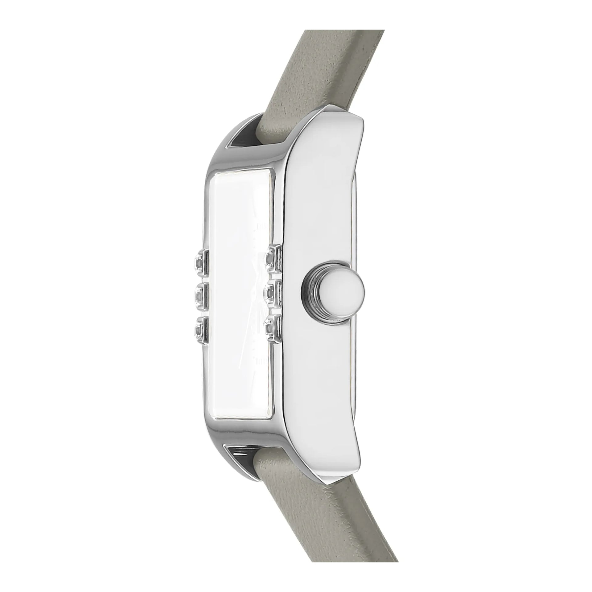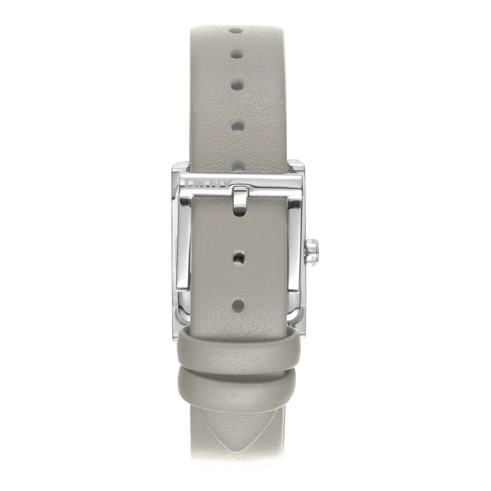El DKNY Westside Glitz es un testimonio de glamour discreto. Su caja y esfera rectangulares en gris plateado se complementan con una correa de cuero flexible, creando un conjunto elegante. El cierre de hebilla de lengüeta asegura un ajuste seguro, convirtiéndolo en un compañero perfecto para cualquier ocasión.