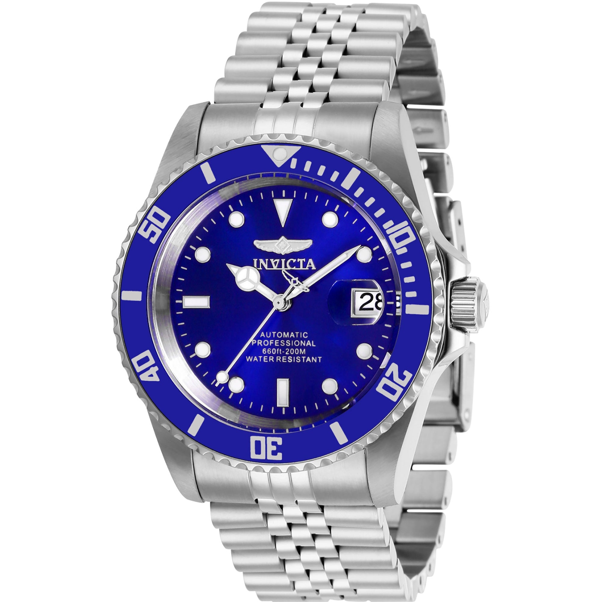 Embrace adventure with the Invicta Pro Diver Automatic Watch for men. Powered by the precise SEIKO NH35A automatic movement, featuring 24 jewels and a convenient date display, this timepiece ensures unwavering accuracy for the adult male. Built for the depths, its robust 42mm silver-grey stainless steel case with a captivating blue count-up bezel offers an impressive Diver's 200mt water resistance, safeguarded by a secure screw-down crown. A resilient Hardlex crystal protects the vibrant blue metal dial, equipped with luminous hands and indexes for superior legibility in any condition. The transparent case back proudly displays the mechanical artistry within. A matching 22mm silver-grey stainless steel band, secured with a folding deployant clasp and safety lock, provides a comfortable and secure fit, perfect for casual wear. Weighing 147g, this Invicta Pro Diver commands a confident presence on the wrist. Each Invicta Pro Diver arrives in its official Invicta Standard Watch Box, making it an ideal gift or personal statement piece.