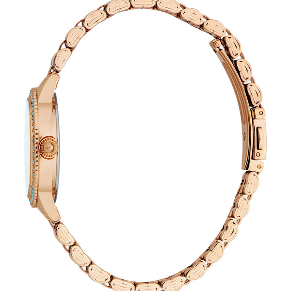 En el ámbito de los relojes vanguardistas, la colección Just Cavalli Glam Chic se erige como un testimonio de elegancia y estilo. Elaborado con precisión, este reloj Just Cavalli es una obra maestra de diseño refinado, que irradia una sensación de sofisticación tanto atemporal como contemporánea. La caja redonda, bañada en un lujoso tono oro rosa, captura la esencia de la feminidad moderna, mientras que su diámetro de 30 mm asegura una presencia delicada pero llamativa en la muñeca. La esfera azul claro, que recuerda a un cielo despejado de verano, añade un toque de color que refleja el espíritu audaz y aventurero de quien lo lleva. Este toque vibrante se complementa perfectamente con la correa de acero inoxidable en oro rosa, que se ajusta a la muñeca con un cierre desplegable tipo mariposa, garantizando comodidad y seguridad. El cristal mineral protege la esfera, mientras que la corona de tipo pull & push ofrece facilidad de ajuste. Impulsado por un movimiento de cuarzo preciso, este reloj promete fiabilidad y exactitud, convirtiéndolo en un accesorio esencial para la mujer consciente de la moda. Resistente al agua, está diseñado para soportar las exigencias de la vida diaria, mientras que su visualización de tres agujas ofrece un toque clásico. Este reloj Just Cavalli no es solo un reloj, es una declaración de estilo, un reflejo de la personalidad única de quien lo lleva y una celebración del arte de la relojería.