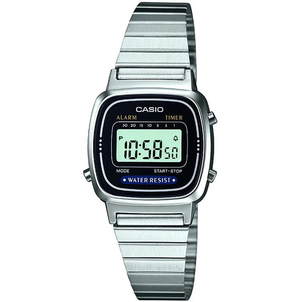 The crisp black LCD dial, driven by a reliable Casio 3191 Quartz movement, showcases a full digital display. Stay organized with the integrated day, date, and month calendar, stopwatch, alarm, and timer functions. Protected by a resilient plastic crystal and designed to be water-resistant, this Casio watch (model LA-670WEA-1EF) is built for daily adventures.