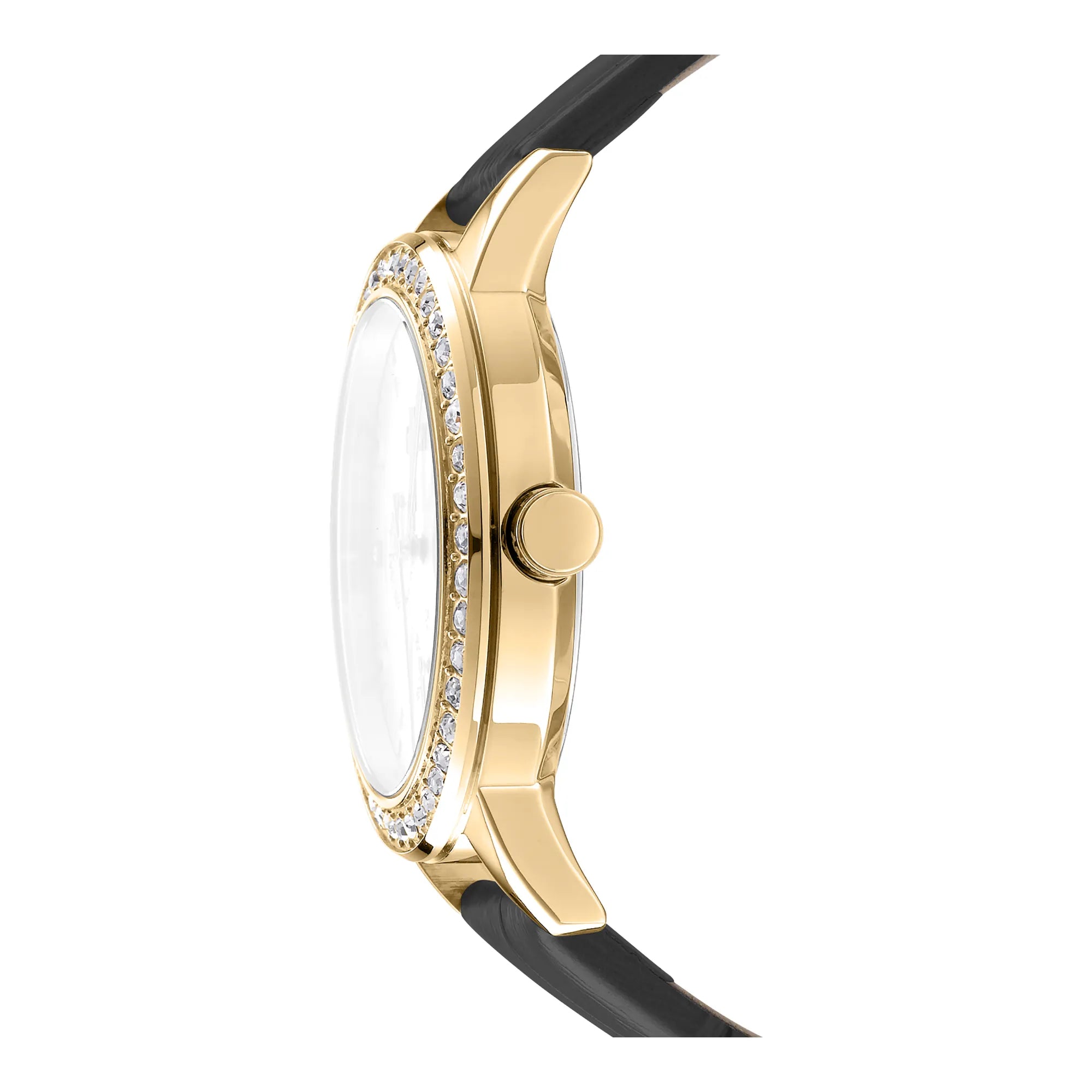 En el bullicioso corazón de la ciudad de Nueva York, donde la moda se encuentra con la función, surge un reloj que encarna el espíritu de la elegancia moderna: el DKNY Parsons Multi Glitz. Este exquisito reloj, diseñado para la mujer contemporánea, es un testimonio de la combinación perfecta entre estilo y practicidad. Su caja redonda, bañada en el cálido resplandor del oro amarillo, captura la atención con un diámetro de 40 mm, ofreciendo un equilibrio perfecto entre audacia y sofisticación. El diseño refinado se complementa con una elegante correa de cuero negro, asegurada con una clásica hebilla de ardillón, garantizando tanto comodidad como estilo. Bajo el cristal mineral, la esfera negra sirve como lienzo para la pantalla multifunción, donde el tiempo no solo se indica, sino que se celebra. El movimiento de cuarzo, impulsado por el fiable Caliber 6P29, asegura precisión, mientras que el calendario de día y fecha añade un toque de practicidad a este accesorio a la moda. Con una resistencia al agua de hasta 50 metros, este reloj es tan versátil como elegante, listo para acompañarte desde la sala de juntas hasta una noche en la ciudad. El DKNY Parsons Multi Glitz es más que un reloj, es una pieza de declaración, un reflejo del mundo dinámico y en constante evolución de la moda, elaborado a la perfección para quienes se atreven a destacar.