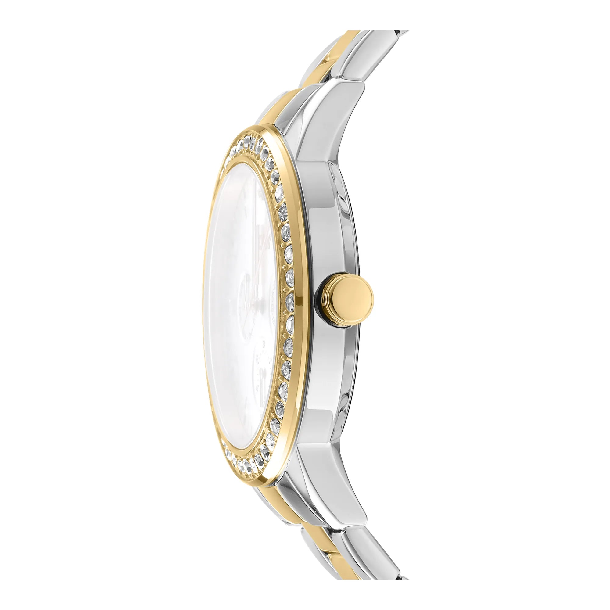 En el corazón de la elegancia urbana, el reloj DKNY Parsons Multi Glitz emerge como un faro de estilo contemporáneo y sofisticación. Elaborado con un diseño refinado, este reloj es un testimonio de la moda moderna, combinando sin esfuerzo la funcionalidad con el atractivo estético. La caja redonda, bañada en un elegante tono gris plateado, encierra un cristal mineral que protege la intrincada esfera debajo. La esfera verde botella, un guiño a la elegancia atemporal, está adornada con pantallas multifunción, incluyendo un calendario de día y fecha, impulsado por el preciso movimiento de cuarzo 6P29. Este reloj no es solo un accesorio, es una declaración de gracia y precisión. La correa de acero inoxidable, que combina con la caja en su brillo gris plateado, se ajusta a la muñeca con un cierre desplegable tipo mariposa, asegurando tanto seguridad como estilo. Con una resistencia al agua de hasta 50 metros, es tan práctico como hermoso, listo para acompañarte en las aventuras de la vida. Diseñado para la mujer moderna que aprecia tanto la forma como la función, este reloj DKNY es una celebración del pensamiento vanguardista en moda y la artesanía meticulosa.