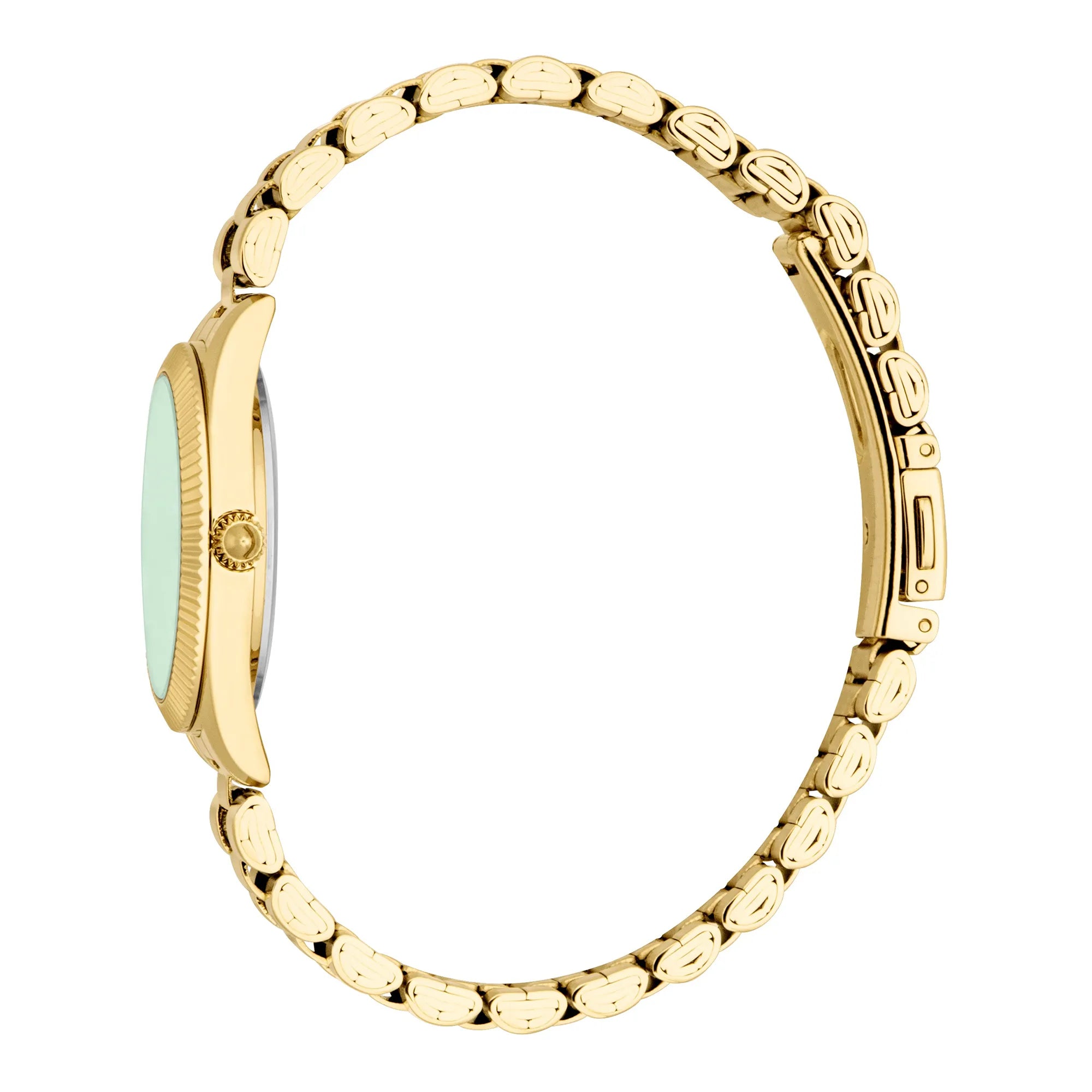 Reloj elaborado con un diseño refinado para la mujer moderna, esta elegante pieza pesa 54 g y combina una caja redonda de acero dorado amarillo con una esfera verde botella que capta la luz con una sutil profundidad. El cristal mineral protege la cara con durabilidad para el uso diario mientras que la corona de tirar y empujar asegura un ajuste de hora sencillo. La construcción resistente al agua ofrece protección práctica para el uso diario. Una correa de acero inoxidable complementa la caja en tono y acabado, asegurada por un cierre desplegable con botón pulsador para un cierre seguro. Diseñado para un estilo femenino y una presencia refinada, este reloj equilibra una estética elegante con una funcionalidad confiable, convirtiéndolo en un accesorio versátil desde el día hasta ocasiones nocturnas.