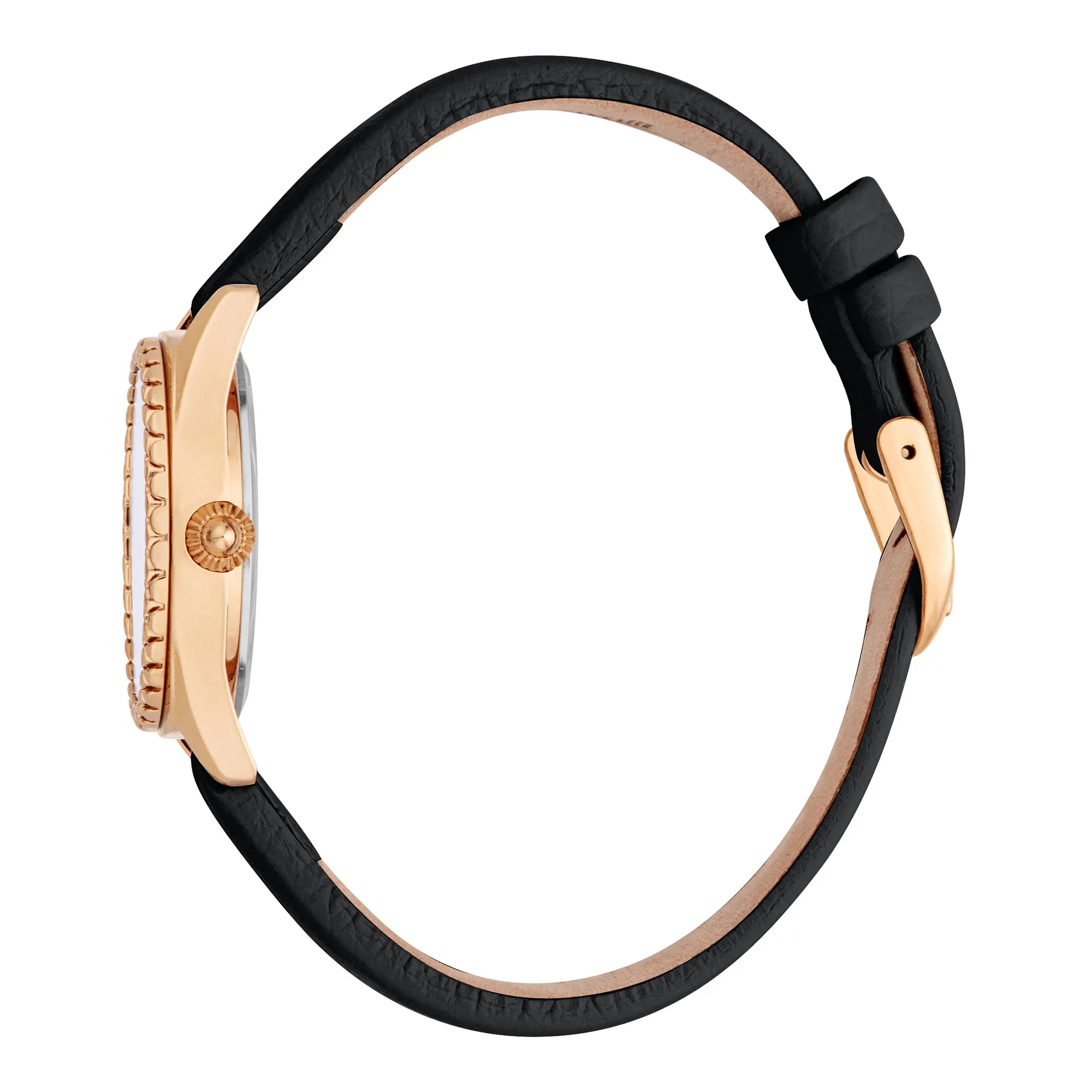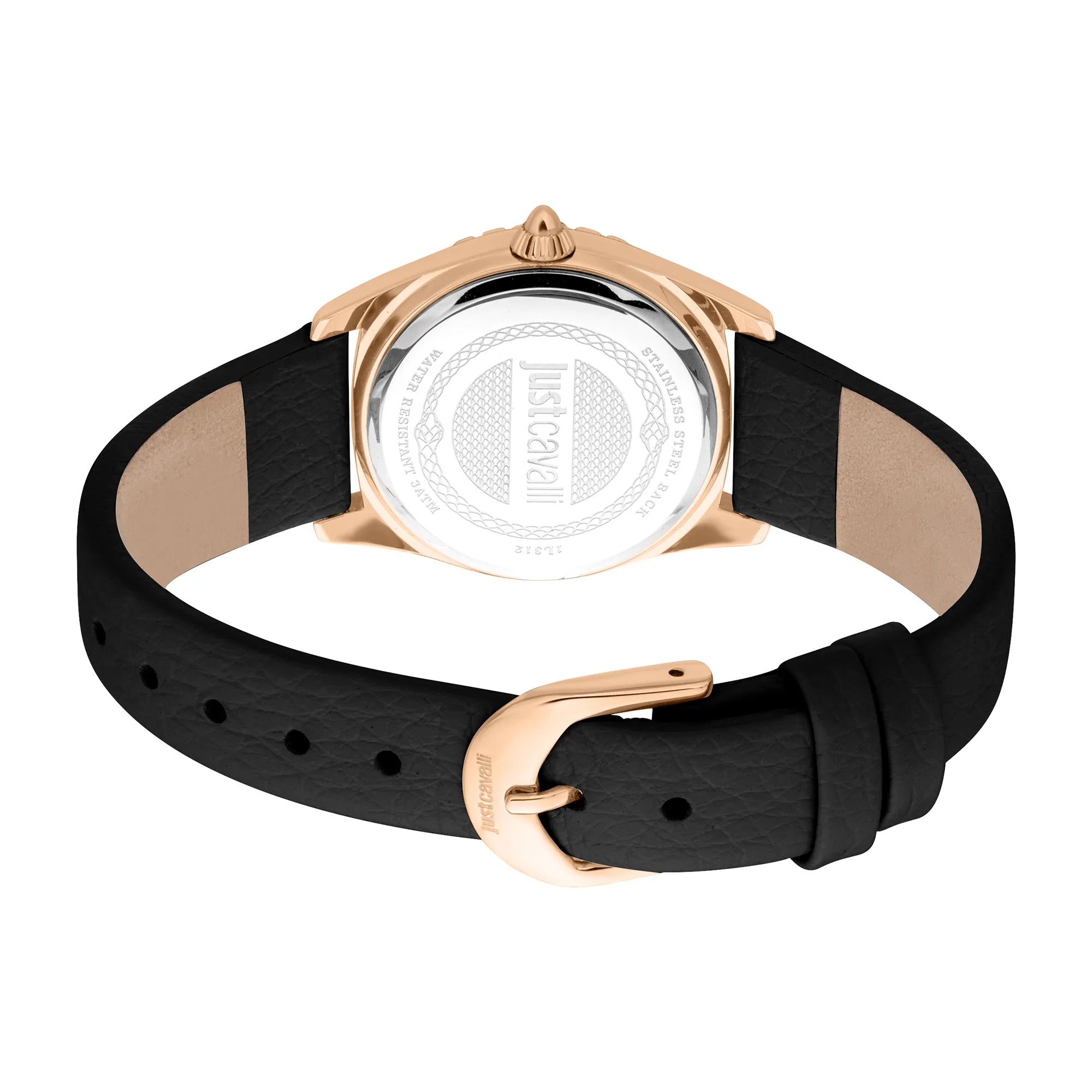 En el ámbito de la moda, donde la elegancia se encuentra con la audacia, surge un reloj que captura la esencia de la sofisticación audaz. Elaborado en el corazón del estilo, este Just Cavalli Watch, el JC1L312 Indomitable Animalier, es un testimonio del espíritu intrépido de la feminidad moderna. Su caja redonda, bañada en el cálido resplandor del oro rosa, emana un atractivo refinado que es tanto atemporal como contemporáneo. El diámetro de 30 mm logra un equilibrio perfecto entre sutileza y declaración, convirtiéndolo en un compañero ideal para cualquier ocasión. El cristal mineral protege una esfera violeta vibrante, un toque de color que añade un toque juguetón pero elegante al conjunto. Este tono atrevido se complementa con la elegante correa de cuero negro, que se ajusta a la muñeca con un cierre de hebilla de lengüeta, garantizando tanto comodidad como estilo. El movimiento de cuarzo del reloj, impulsado por el calibre VJ32, promete precisión, mientras que el calendario de fecha y la visualización de tres agujas ofrecen practicidad sin comprometer la elegancia. Resistente al agua y diseñado para la mujer vanguardista, este reloj es más que un accesorio, es una declaración de individualidad y fortaleza. Con cada tic, susurra historias de aventura y confianza, invitando a su portadora a abrazar su viaje único con gracia y estilo.