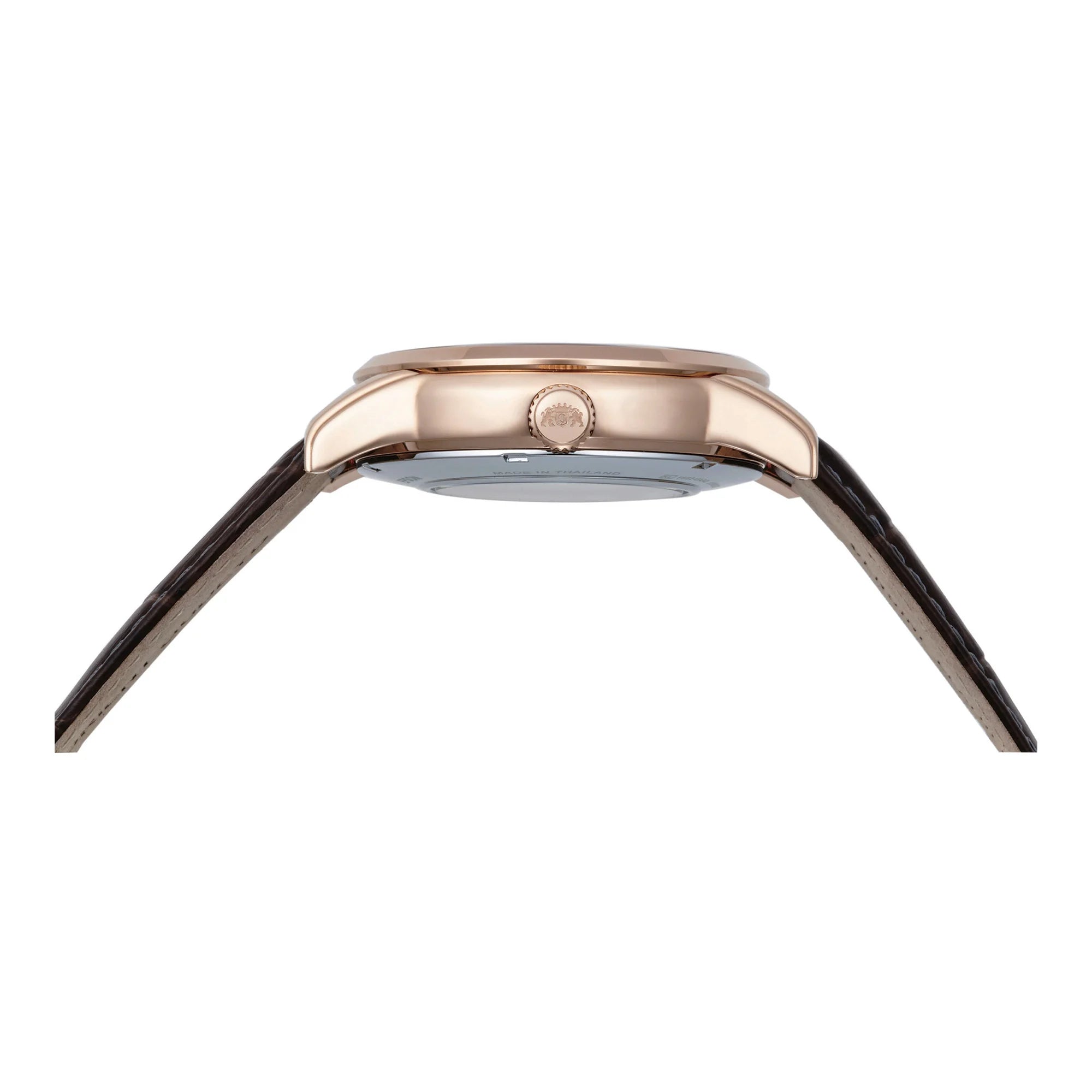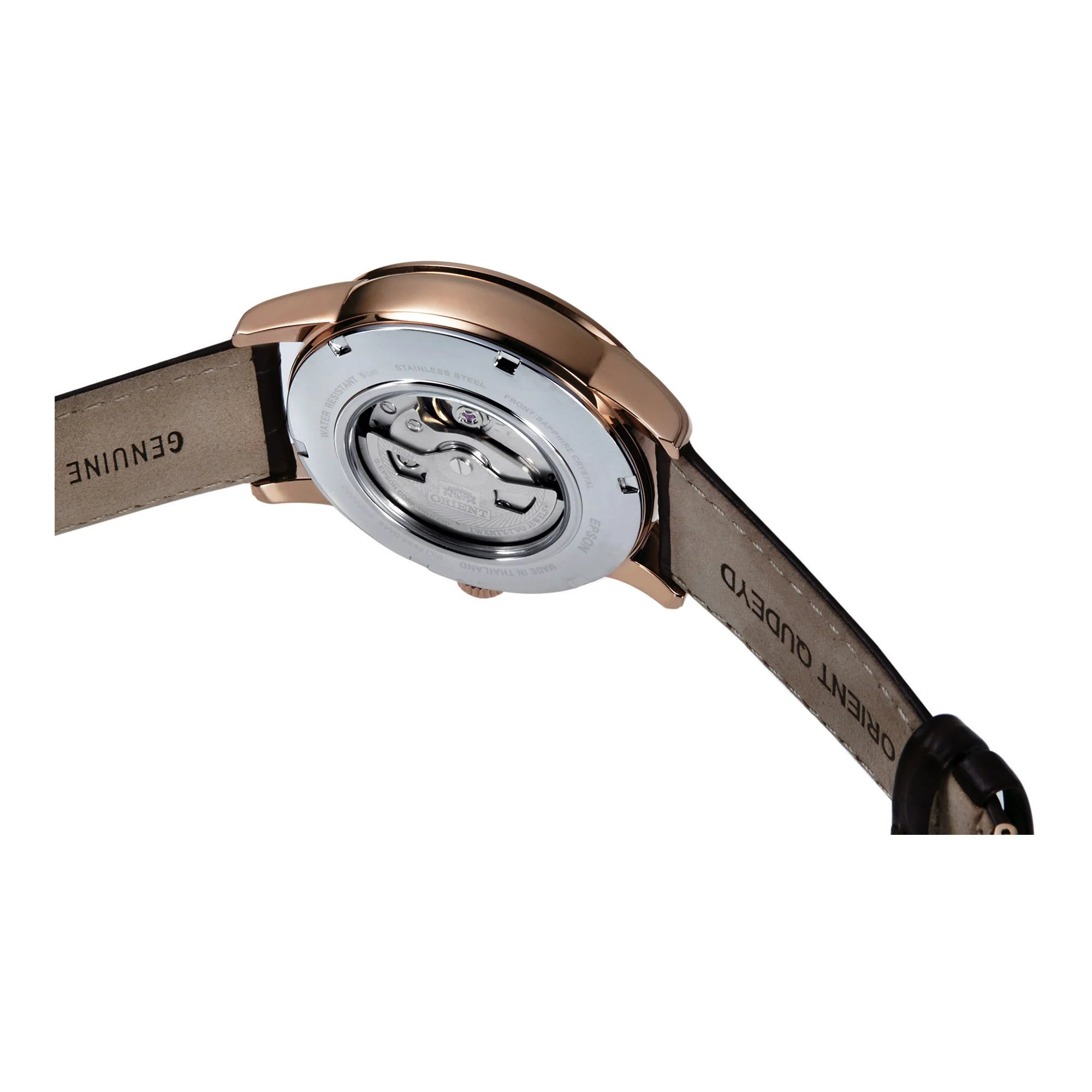 En el ámbito de la relojería, donde los relojes no son meramente instrumentos sino narradores de historias, el ORIENT Classic AK00 Sun & Moon emerge como un testimonio de elegancia atemporal y maestría mecánica. Elaborado en el corazón de la ingeniería de precisión, este reloj encarna la mezcla perfecta de tradición e innovación. Su caja redonda, bañada en el cálido resplandor del oro rosa, captura la mirada con una presencia sutil pero imponente. Con 42 mm de diámetro, logra un equilibrio armonioso entre audacia y sofisticación, convirtiéndolo en un compañero ideal para el caballero exigente. La esfera marrón chocolate, que recuerda al rico y aterciopelado cacao, sirve como lienzo para la intrincada danza del tiempo, con tres manecillas que se deslizan con gracia sobre su superficie. La complicación de calendario de día y fecha añade una capa de practicidad, integrada sin esfuerzo en el diseño. Bajo el cristal de zafiro, el corazón del reloj late con la precisión del calibre F6B24, una maravilla mecánica que cuenta con 22 rubíes. Este movimiento, tanto de cuerda manual como automático, asegura que el tiempo se mantenga con una precisión de +25/-15 segundos por día. La parte trasera transparente ofrece una vista de los intrincados mecanismos, un recordatorio de la artesanía que reside en su interior. Rodeando la muñeca con una correa de cuero marrón chocolate, el reloj se asegura con un cierre desplegable plegable, ofreciendo tanto comodidad como seguridad. Con una resistencia al agua de 50 metros, es tan versátil como elegante, listo para acompañar a su portador desde reuniones en la sala de juntas hasta veladas nocturnas. El ORIENT Classic AK00 Sun & Moon no es solo un reloj, es una celebración del tiempo mismo, una pieza que susurra historias de herencia e innovación con cada tic.