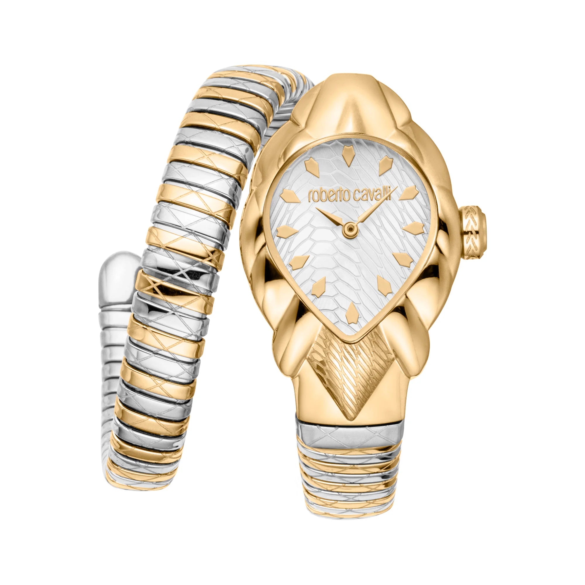 El reloj Roberto Cavalli Lady es una obra maestra de elegancia dorada. Su caja ovalada de oro amarillo contrasta maravillosamente con una esfera y correa gris plateada, ofreciendo un atractivo sofisticado. Resistente al agua y con cristal mineral, es un faro de estilo.