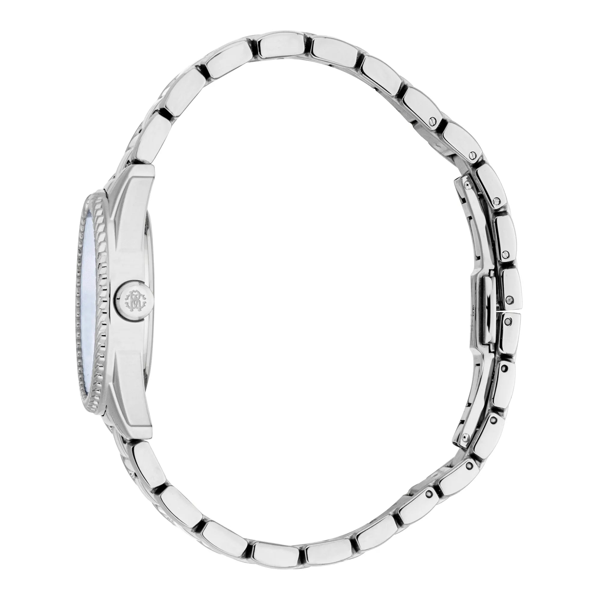 El reloj Roberto Cavalli Lady en gris plateado irradia sofisticación. Su caja redonda y esfera azul se complementan con una correa de acero inoxidable, ofreciendo una combinación perfecta de elegancia y durabilidad. Resistente al agua hasta 50 metros, es un compañero perfecto para la mujer moderna.