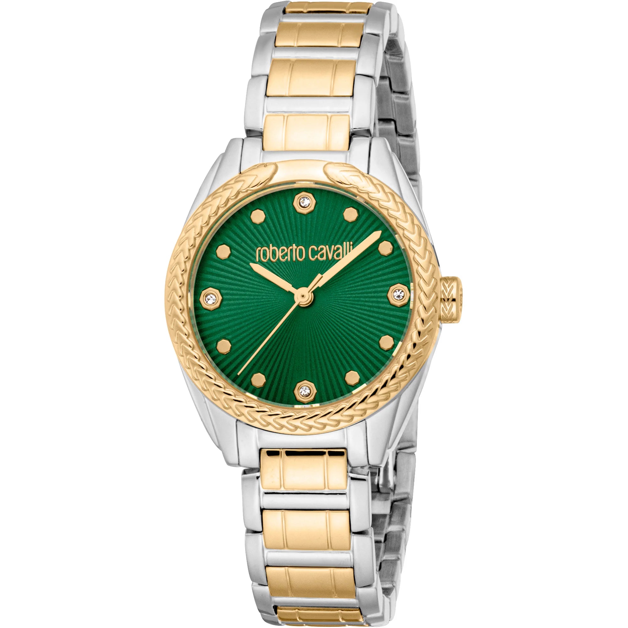 En el mundo de la moda, donde la elegancia se encuentra con la innovación, surge un reloj que captura la esencia de la sofisticación y el estilo. Fabricado en el corazón de la relojería suiza, este reloj Roberto Cavalli Lady es un testimonio de diseño refinado y atractivo atemporal. Su caja redonda, bañada en un lustroso gris plateado, enmarca una esfera verde botella hipnotizante que evoca una sensación de lujo sereno. El cristal mineral ofrece una vista clara de la esfera, donde tres manecillas bailan con gracia, impulsadas por la precisión de un movimiento de cuarzo con calibre GL32. La correa de acero inoxidable, también en gris plateado, se envuelve alrededor de la muñeca con una sensación de fluidez, asegurada por un cierre desplegable tipo mariposa con botón pulsador para facilidad y comodidad. Con un diámetro de caja de 30 mm, este reloj es el compañero perfecto para la mujer moderna que valora tanto el estilo como la funcionalidad. Resistente al agua hasta 50 metros, está diseñado para acompañarte en las aventuras de la vida, ya sea navegando por la jungla urbana o disfrutando de un día sereno junto al agua. La corona de tirar y empujar añade un toque de practicidad, asegurando que el tiempo esté siempre al alcance de tus dedos. Este reloj Roberto Cavalli es más que un accesorio, es una declaración de elegancia y una celebración del arte de la relojería, destinado a convertirse en una pieza apreciada en cualquier colección.