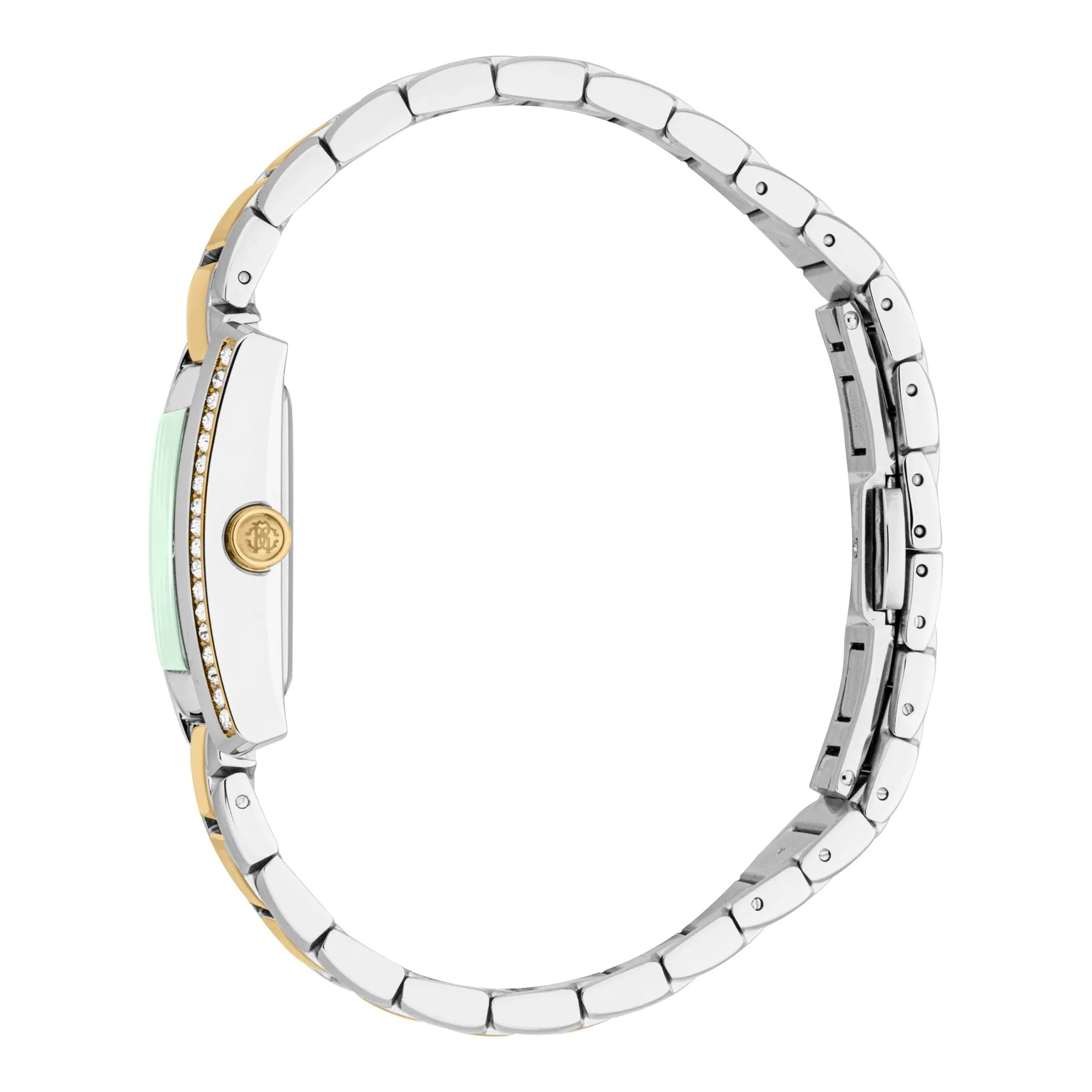Experimenta el encanto de la naturaleza con el reloj Roberto Cavalli Lady. Una caja rectangular plateado-gris y una esfera verde botella evocan una sensación de tranquilidad, complementadas por una correa de acero inoxidable en oro amarillo. Resistente al agua y fabricado con un cristal mineral, es un accesorio sereno pero elegante.