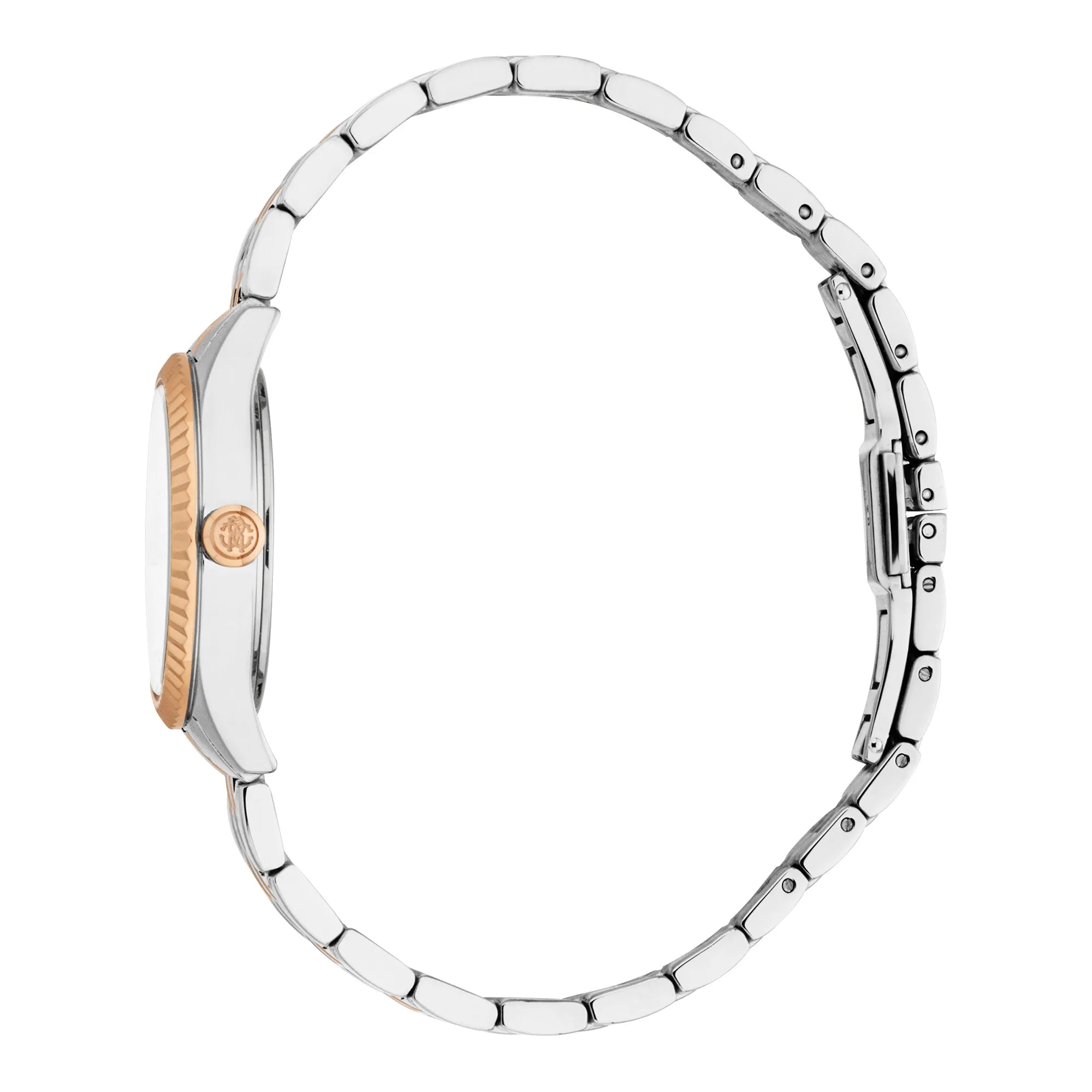 En el mundo de la moda, donde la elegancia se encuentra con la precisión, surge un reloj que encarna la esencia de la sofisticación y el estilo. Elaborado en el corazón de la relojería suiza, este reloj Roberto Cavalli Lady es un testimonio de diseño refinado y atractivo atemporal. Su caja redonda, bañada en un lustroso gris plateado, captura la luz con cada movimiento, mientras que el diámetro de 28 mm asegura una presencia delicada pero llamativa en la muñeca. El cristal mineral protege la esfera blanca ostra, donde tres agujas bailan con gracia, impulsadas por el fiable movimiento de cuarzo GL32. Una corona de tirar y empujar ofrece un ajuste sin esfuerzo, realzando el encanto fácil de usar del reloj. La correa de acero inoxidable, también en gris plateado, envuelve la muñeca con un sentido de continuidad y gracia, asegurada por un cierre desplegable tipo mariposa con botón pulsador para una elegancia sin esfuerzo. Con una resistencia al agua de hasta 50 metros, este reloj no es solo una declaración de moda, sino un compañero versátil para la mujer moderna. Su diseño habla a quienes aprecian las cosas finas de la vida, donde cada detalle está meticulosamente elaborado a la perfección. Este reloj Roberto Cavalli Lady es más que un accesorio, es una celebración de la feminidad y la moda, una pieza que susurra lujo con cada tic, invitándote a abrazar el arte de medir el tiempo con una gracia inigualable.