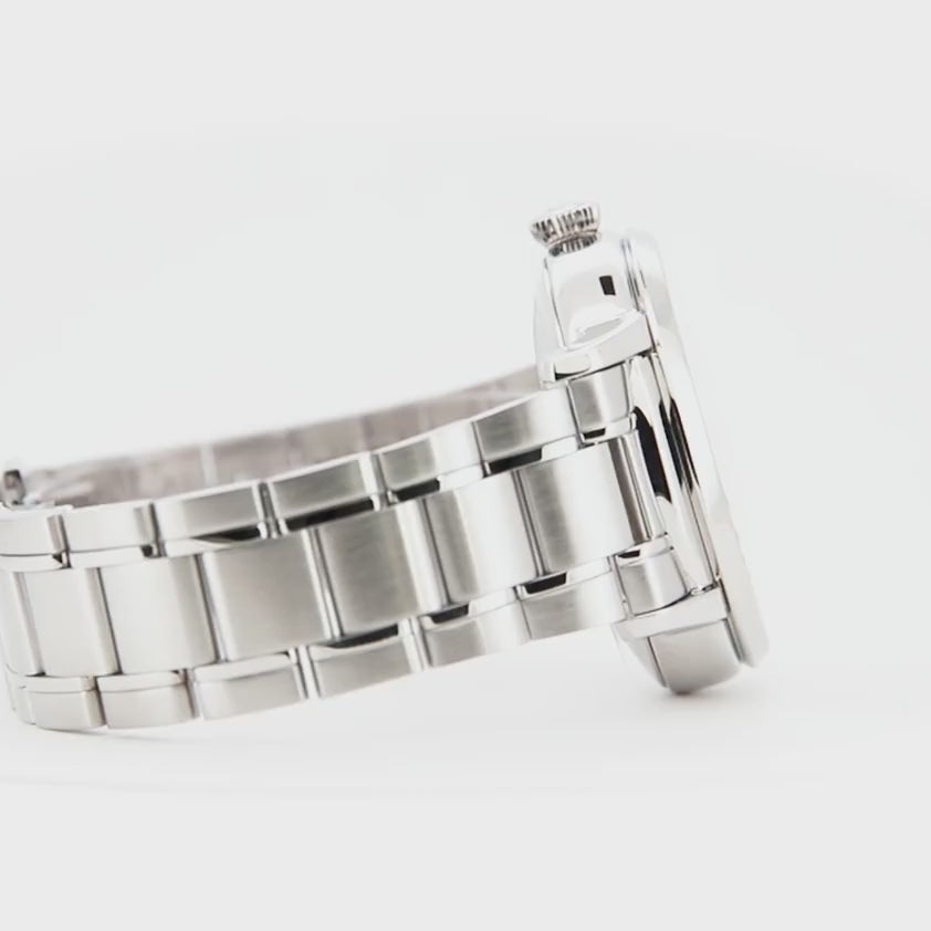 The watch is secured with a matching silver-grey stainless steel bracelet, 20mm wide, featuring a convenient butterfly deployant clasp with a push-button for a comfortable and secure fit. With a water resistance of 50 meters (5 ATM), it is suitable for everyday wear.