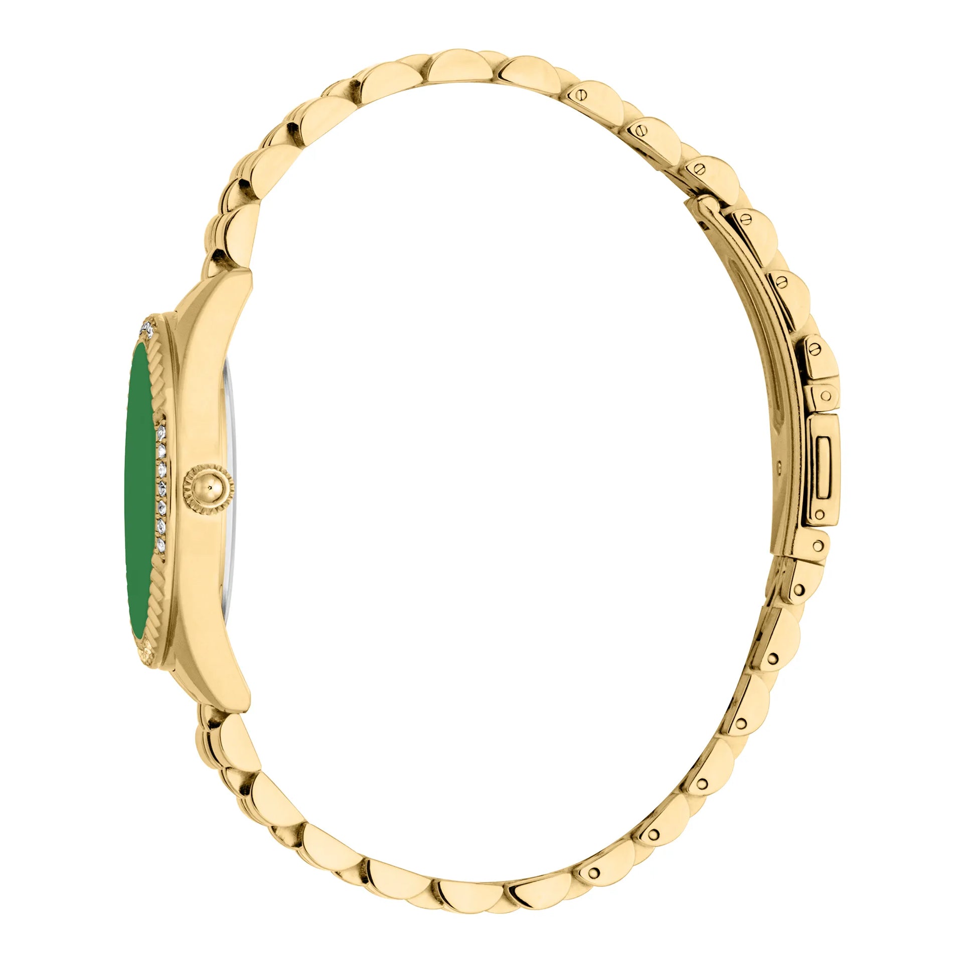 En el reino de la elegancia atemporal, donde la moda se encuentra con la precisión, surge una obra maestra que captura la esencia de la sofisticación y el estilo. Elaborado en el corazón de la excelencia horológica, este Just Cavalli Watch de la colección JC1L361 Vittoria Glam es un testimonio de diseño refinado y artesanía exquisita. Su caja redonda, bañada en el cálido resplandor del oro amarillo, emana un aura de lujo y gracia, complementando perfectamente la delicada muñeca de la mujer moderna. La correa de acero inoxidable, también en un tono oro amarillo a juego, se envuelve alrededor de la muñeca con un sentido de opulencia, asegurada por un cierre desplegable con botón pulsador para facilidad y comodidad. En el corazón de este reloj se encuentra una esfera verde botella, un tono profundo y encantador que evoca un sentido de misterio y atractivo. El cristal mineral protege la esfera, asegurando claridad y durabilidad, mientras que la corona de tirar y empujar ofrece un ajuste sin esfuerzo. Impulsado por un movimiento de cuarzo preciso, este reloj promete fiabilidad y exactitud, convirtiéndolo en un compañero indispensable para cualquier ocasión. Resistente al agua, se mantiene firme contra los elementos, permitiendo que quien lo lleva abrace las aventuras de la vida con confianza. Este Just Cavalli Watch no es solo un reloj, es una declaración de elegancia vanguardista, una celebración de la feminidad y un símbolo del espíritu audaz que define a la mujer moderna.