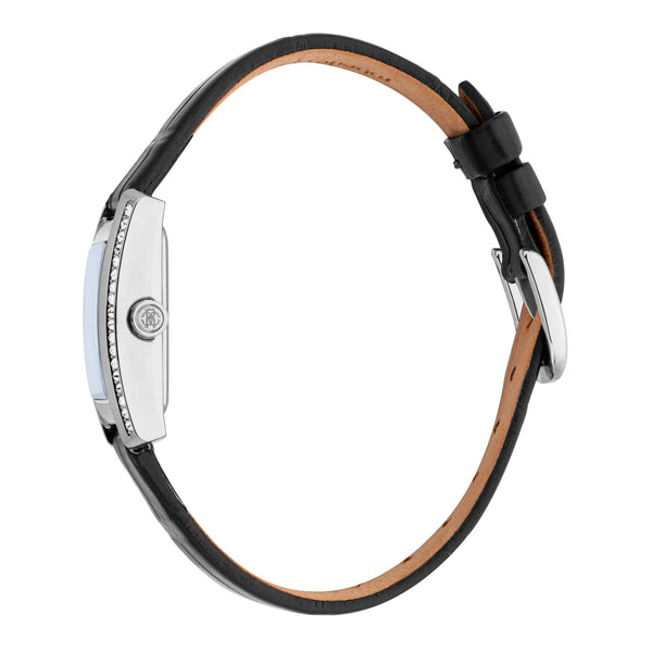 El reloj Roberto Cavalli Lady, con su caja rectangular plateada gris y esfera azul noche, es una obra maestra del diseño moderno. Una correa de cuero negra añade un toque de elegancia clásica, convirtiéndolo en un accesorio versátil para cualquier mujer a la moda.
