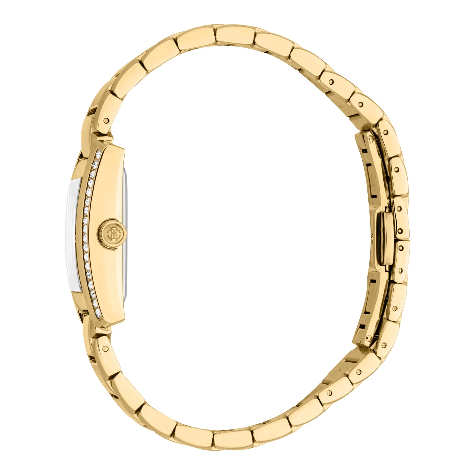 Irradia opulencia con el reloj Roberto Cavalli Lady, donde una caja rectangular de oro amarillo se encuentra con una esfera gris plateada. La correa de acero inoxidable, en oro a juego, complementa el cierre desplegable de mariposa, ofreciendo tanto estilo como seguridad. Resistente al agua y adornado con un cristal mineral, encarna la elegancia atemporal.