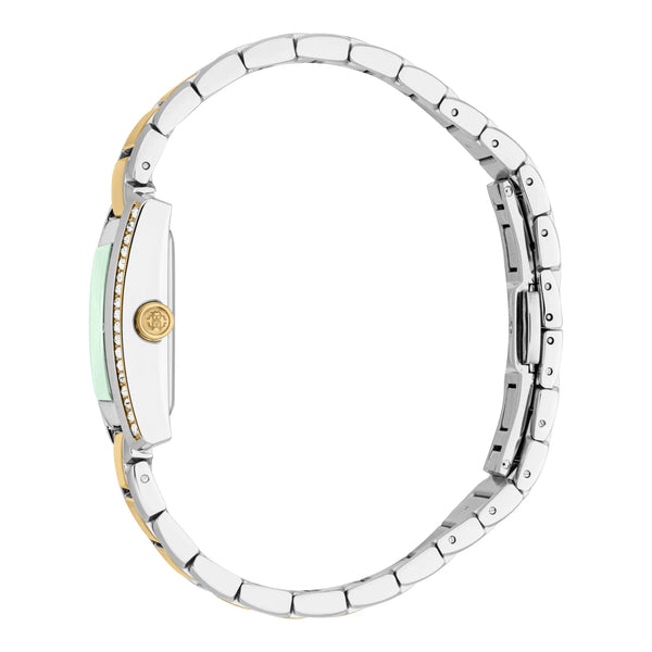 En el mundo de la moda, donde la elegancia se encuentra con la innovación, surge un reloj que encarna la esencia de la sofisticación y el estilo. Fabricado en el corazón de la relojería suiza, este reloj Roberto Cavalli Lady es un testimonio de diseño refinado y artesanía exquisita. Su caja rectangular, bañada en un elegante tono gris plateado, emana un atractivo moderno que es a la vez atemporal y contemporáneo. El cristal mineral protege una esfera de verde botella profundo, un color que susurra misterio y profundidad, complementando perfectamente la estética vanguardista del reloj. La correa de acero inoxidable, chapada en un lujoso oro amarillo, se envuelve alrededor de la muñeca con un sentido de opulencia, asegurada por un cierre desplegable tipo mariposa con botón pulsador para facilidad y elegancia. En su interior, la precisión de un movimiento de cuarzo, impulsado por el calibre GL34, garantiza que el tiempo se mantenga con una exactitud inquebrantable. La visualización de tres agujas se desliza con gracia por la esfera, una danza del tiempo que es a la vez hipnotizante y precisa. Resistente al agua, este reloj es tan práctico como hermoso, listo para acompañar a su portadora en las aventuras de la vida. Diseñado para la mujer moderna que aprecia las cosas finas, este reloj Roberto Cavalli Lady es más que un simple reloj, es una declaración de estilo, un reflejo de carácter y una celebración del arte de la relojería.