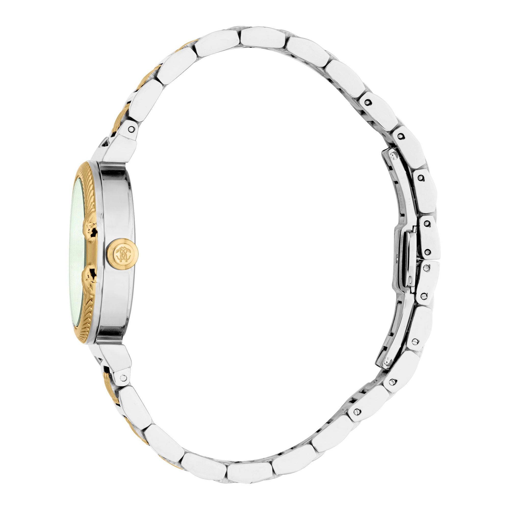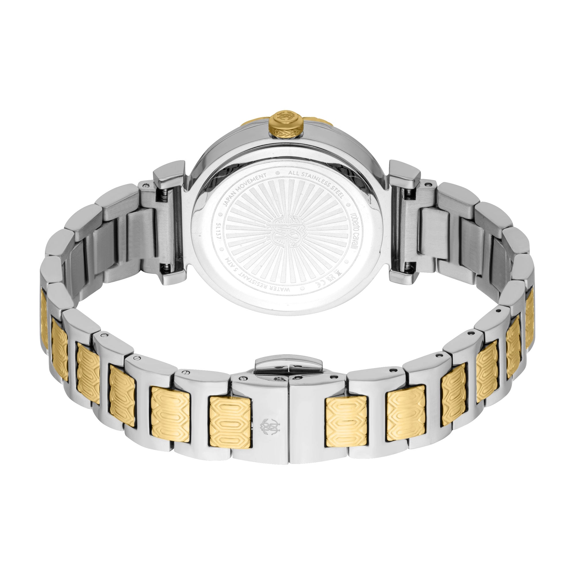 Powered by a reliable **CITIZEN GL34 Quartz movement** with a classic 3-hand display, this Roberto Cavalli watch guarantees accurate and dependable timekeeping. With **WR 50mt water resistance**, it's perfectly suited for daily wear and light water exposure, offering peace of mind. The elegant **stainless steel band**, echoing the case's luxurious silver grey and yellow gold IP plating, secures comfortably with a convenient **folding deployant clasp with push-button**, providing both style and security.