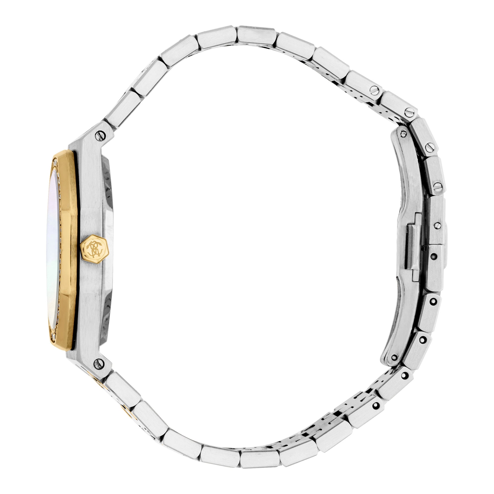 Abraza el encanto eterno con este exquisito reloj Roberto Cavalli, diseñado para la mujer moderna que define su propio estilo. Su cautivador diseño bicolor en acero inoxidable, resplandeciente con brillantes circonios, enmarca una esfera luminosa de nácar. Más que un reloj, es una declaración de elegancia sofisticada, un reflejo de tu brillo interior. Permite que adorne tu muñeca, un acento irresistible para cada momento, desde un almuerzo bañado por el sol hasta eventos nocturnos llenos de glamour.