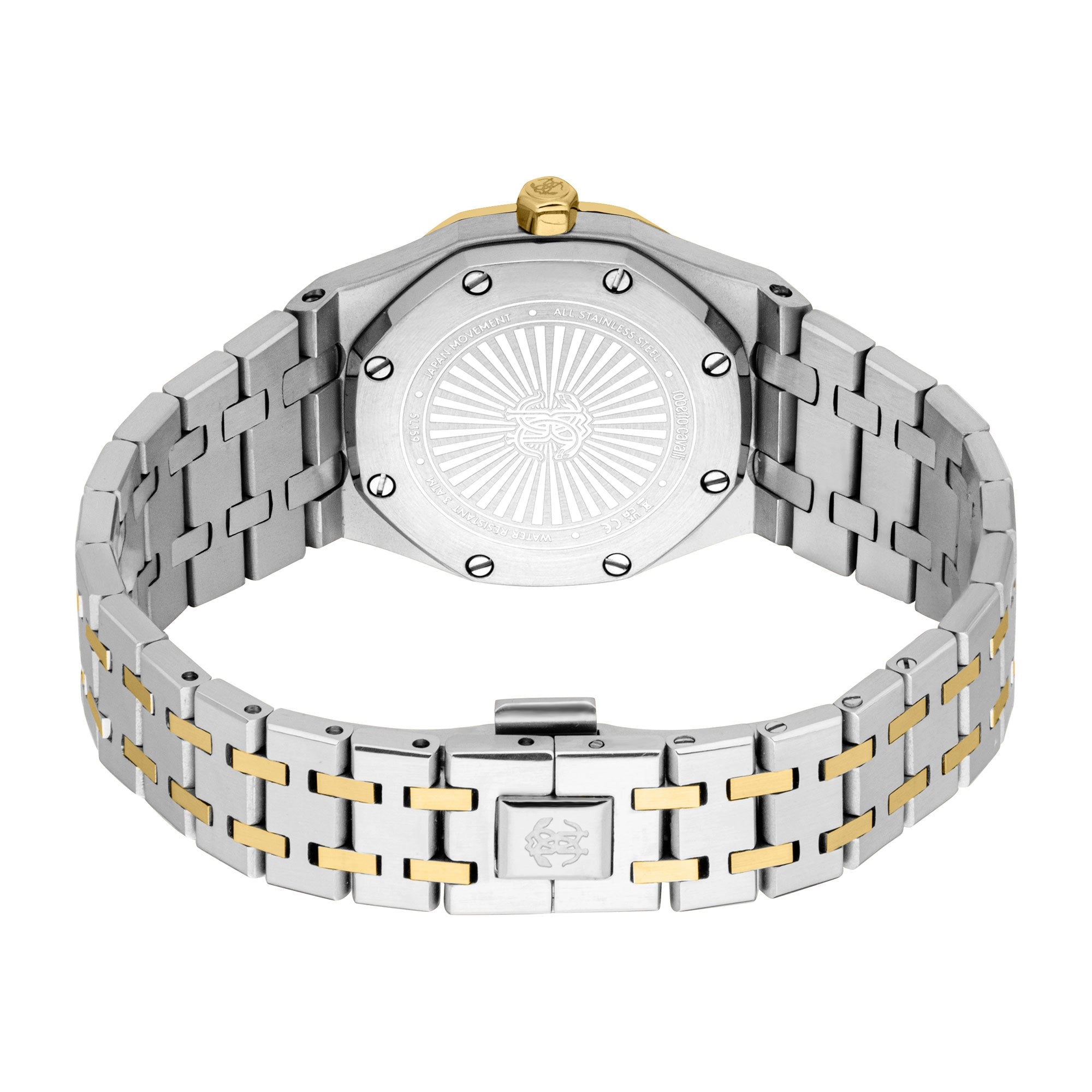 Elevate your style with the exquisite Roberto Cavalli Lady RC5L159M0085, a sophisticated fashion watch crafted for the modern woman. This stunning timepiece showcases a luxurious two-tone design, featuring an IP plated stainless steel case and matching band that beautifully combine silver-grey and radiant yellow gold. The elegant 34mm round case, with a slim 9mm profile, is meticulously adorned with 40 brilliant zircons, adding an undeniable sparkle.