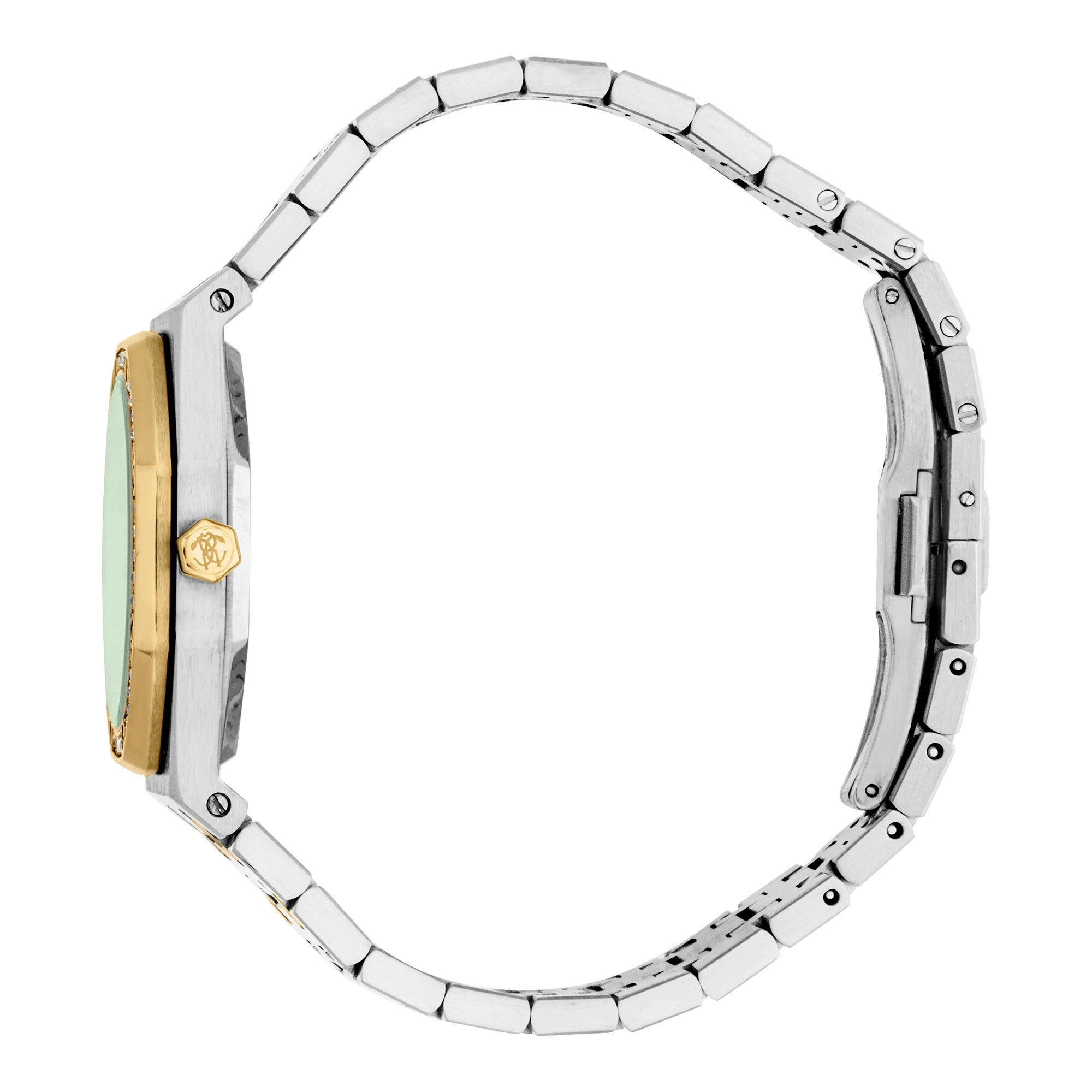 Abraza a tu diosa interior con este cautivador reloj Roberto Cavalli, diseñado para la mujer moderna y vanguardista en la moda. Su exquisito diseño bicolor, que combina un radiante oro y un plateado brillante, enmarca a la perfección una misteriosa esfera verde botella, adornada con deslumbrantes circonitas que captan cada rayo de luz. Más que un reloj, es una declaración de estilo refinado y encanto audaz. Imagínalo adornando tu muñeca, un testimonio silencioso de tu gusto impecable, mientras atraes todas las miradas en cualquier lugar.