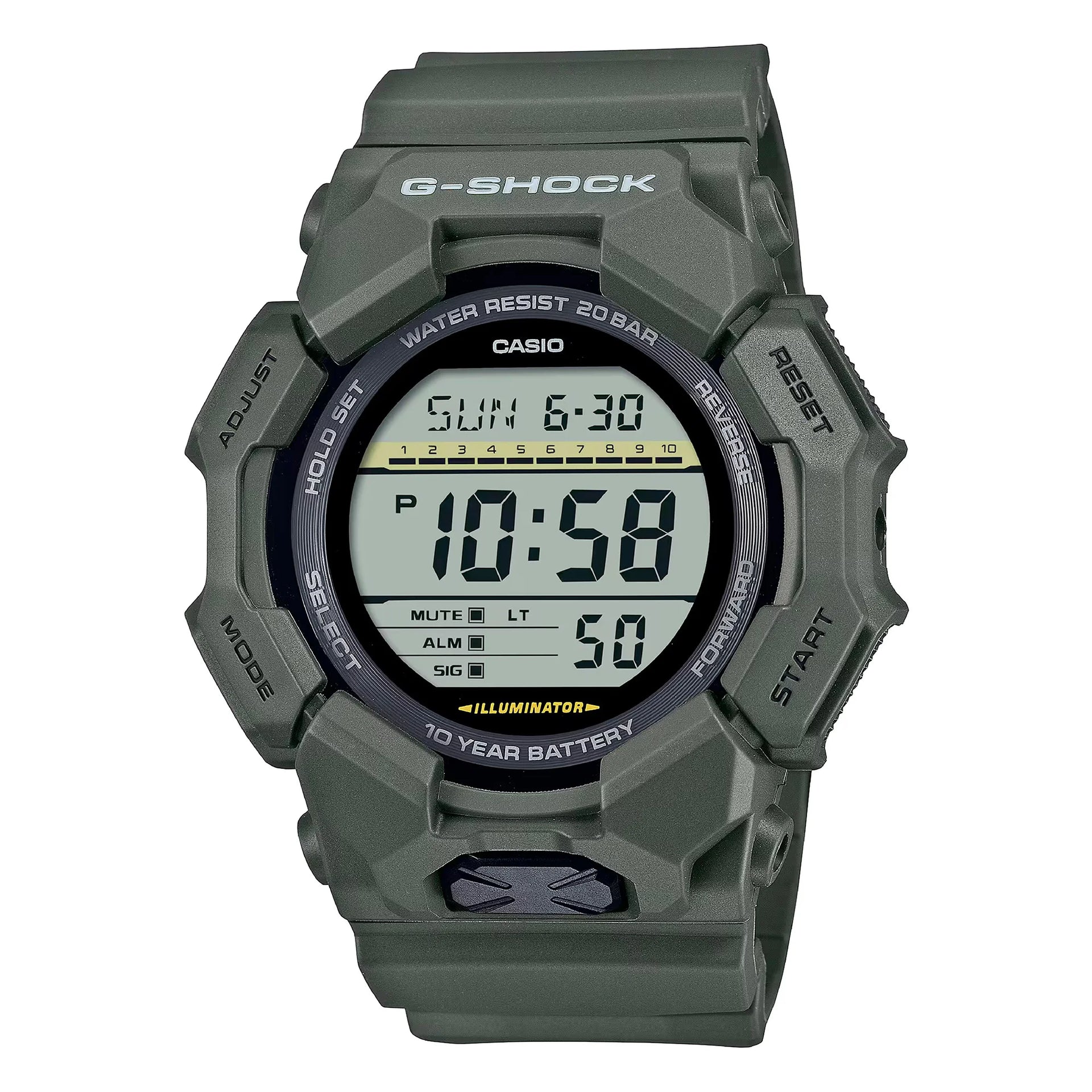 En el ámbito de la medición del tiempo, donde la precisión se encuentra con la aventura, surge una obra maestra que desafía lo ordinario. Diseñado para el explorador moderno, este reloj Casio G-Shock encarna el espíritu de la resistencia y la innovación. Su caja redonda, bañada en un llamativo tono verde oliva, atrae la atención con un diámetro audaz de 52 mm, convirtiéndolo en una pieza emblemática para quienes se atreven a destacar. Diseñado para el alma aventurera, cuenta con una resistencia al agua para buceadores de 200 metros, asegurando que siga siendo un compañero fiel en las profundidades del océano o en las alturas de un sendero montañoso. El cristal mineral protege la pantalla digital, donde el tiempo no solo se cuenta, sino que se experimenta. Con una corona de tirar y empujar, el reloj ofrece una funcionalidad sin interrupciones, mientras que la correa de resina verde oliva, asegurada con una hebilla de pasador, se ajusta cómodamente a la muñeca, reflejando la elegancia robusta de la caja. La esfera negra sirve como lienzo para sus múltiples funciones: un cronógrafo, alarma, temporizador y hora mundial, todos impulsados por un movimiento de cuarzo preciso. El calendario de día, fecha y mes te mantiene sincronizado con el mundo, mientras que el formato de hora de 24 horas atiende al viajero global. Al ponerse el sol, la luz incorporada garantiza claridad en las horas más oscuras, y el indicador de reserva de energía es un testimonio de su rendimiento duradero. Este reloj Casio G-Shock no es solo un accesorio, es un testimonio del espíritu aventurero, un diseño refinado que une funcionalidad con estilo, listo para acompañarte en cada viaje.