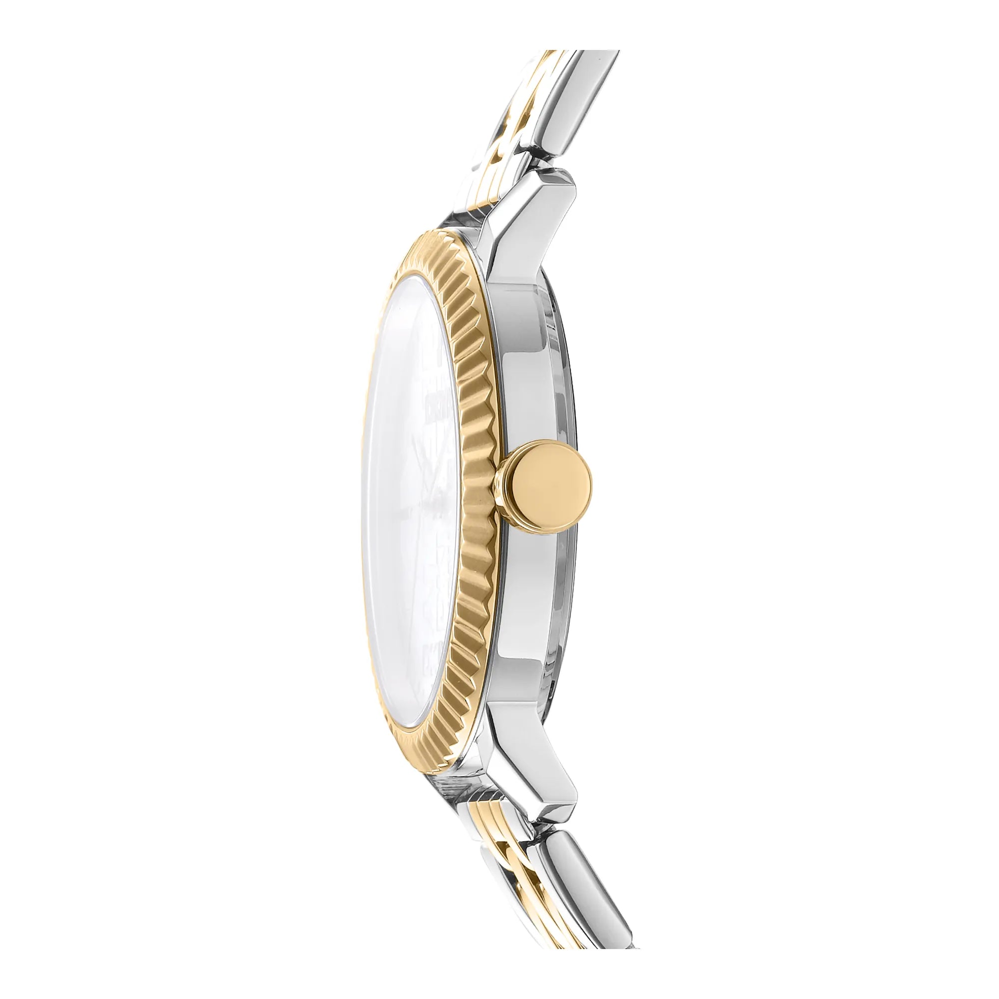 En el bullicioso corazón de la ciudad, donde la moda se encuentra con la funcionalidad, el reloj DKNY Chambers Maxi surge como un faro de elegancia y modernidad. Elaborado con precisión, este reloj es un testimonio del estilo sofisticado de la mujer contemporánea. Su caja redonda, bañada en un elegante tono gris plateado, captura la esencia del estilo urbano chic, mientras que la esfera verde botella añade un toque de la tranquilidad de la naturaleza al paisaje metropolitano. La cara de cristal mineral garantiza claridad y durabilidad, protegiendo la intrincada danza del movimiento de cuarzo de tres agujas que lleva debajo. Una correa de acero inoxidable, también en gris plateado, envuelve la muñeca con un sentido de gracia refinada, asegurada por un cierre desplegable tipo mariposa con botón pulsador para mayor facilidad y comodidad. Con una resistencia al agua de hasta 50 metros, este reloj es tan versátil como elegante, listo para acompañarte desde la sala de juntas hasta una escapada de fin de semana. El DKNY Chambers Maxi no es solo un reloj, es una declaración de pensamiento vanguardista en moda, una mezcla de diseño atemporal y estilo contemporáneo, perfecto para la mujer que navega por el mundo con confianza y aplomo.