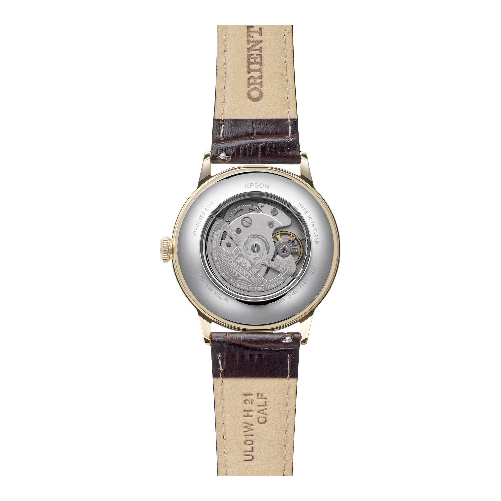 The ORIENT Bambino Classic, part of the acclaimed ORIENT Classic series, features a striking 40mm round stainless steel case in a radiant yellow gold finish, perfectly complementing its clean white dial. A durable mineral crystal protects the face, while the transparent snap-on case back offers a captivating view of the intricate mechanical movement within.