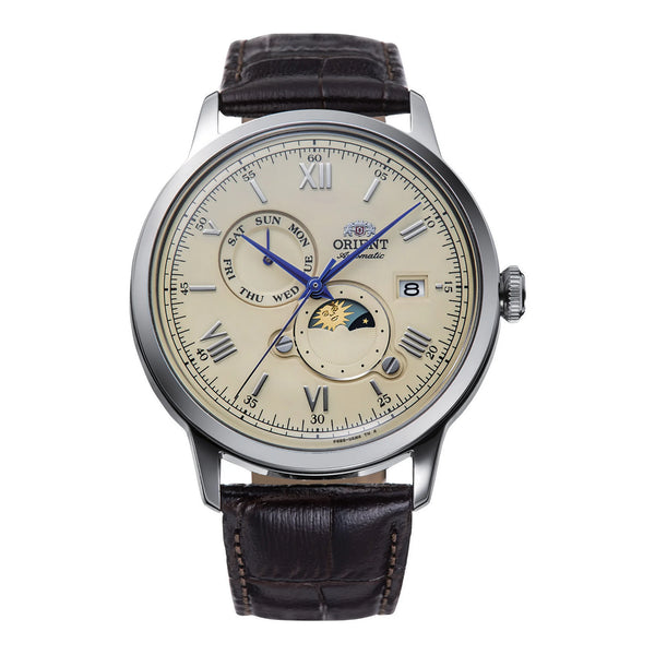 En el reino de la elegancia atemporal, el ORIENT AK08 Bambino Sun & Moon emerge como un faro de sofisticación clásica. Elaborado con meticulosa atención al detalle, este reloj encarna la esencia del diseño refinado. Su caja redonda, bañada en un tono gris plateado, emite una presencia sutil pero imponente en la muñeca, complementando perfectamente la correa de cuero marrón chocolate que se envuelve con un sentido de lujo discreto. La esfera beige, que recuerda a un amanecer sereno, sirve como lienzo para la intrincada danza del tiempo, con tres manecillas que marcan con gracia el paso de cada momento. La complicación sun and moon añade un toque de encanto celestial, un guiño al ciclo eterno del día y la noche. Bajo su cristal mineral, el corazón de esta pieza late con la precisión de un movimiento mecánico, impulsado por el calibre F6B24 con 22 rubíes, asegurando una precisión diaria que habla de su artesanía. La parte trasera transparente ofrece una vista a los intrincados mecanismos, un testimonio del arte interior. Resistente al agua y equipado con una corona de tipo pull & push, este reloj es tan práctico como hermoso. El cierre de hebilla de ardillón garantiza un ajuste seguro, convirtiéndolo en un compañero confiable para el caballero exigente. Con capacidades tanto de cuerda manual como automática, el ORIENT AK08 Bambino Sun & Moon no es solo un reloj, es una declaración de estilo atemporal y calidad duradera.