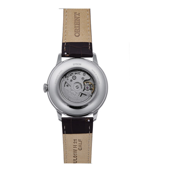 En el reino de la elegancia atemporal, el ORIENT AK08 Bambino Sun & Moon emerge como un faro de sofisticación clásica. Fabricado en el corazón de la excelencia horológica, este reloj encarna la mezcla perfecta de tradición e innovación. Su caja redonda, bañada en un tono gris plateado, irradia un diseño refinado que captura la esencia del lujo discreto. La esfera verde ópalo, un guiño a un toque de color, añade un giro contemporáneo a su porte clásico, convirtiéndolo en una pieza emblemática para el caballero moderno. En su interior se encuentra la maravilla mecánica del calibre F6B24, con 22 joyas que garantizan precisión y fiabilidad. La parte trasera transparente ofrece una vista del intrincado baile de engranajes y resortes, un testimonio del arte interior. Una correa de cuero marrón chocolate, asegurada con una hebilla de ardillón, se ajusta cómodamente a la muñeca, ofreciendo estilo y confort. Con una característica de resistencia al agua, este reloj es tan práctico como elegante. El calendario de día y fecha, junto con la visualización de tres agujas, asegura que el tiempo siempre esté a tu favor. Ya sea de cuerda manual o automático, el ORIENT AK08 Bambino Sun & Moon es una celebración de la maestría horológica, un compañero atemporal para quienes aprecian las cosas finas de la vida.