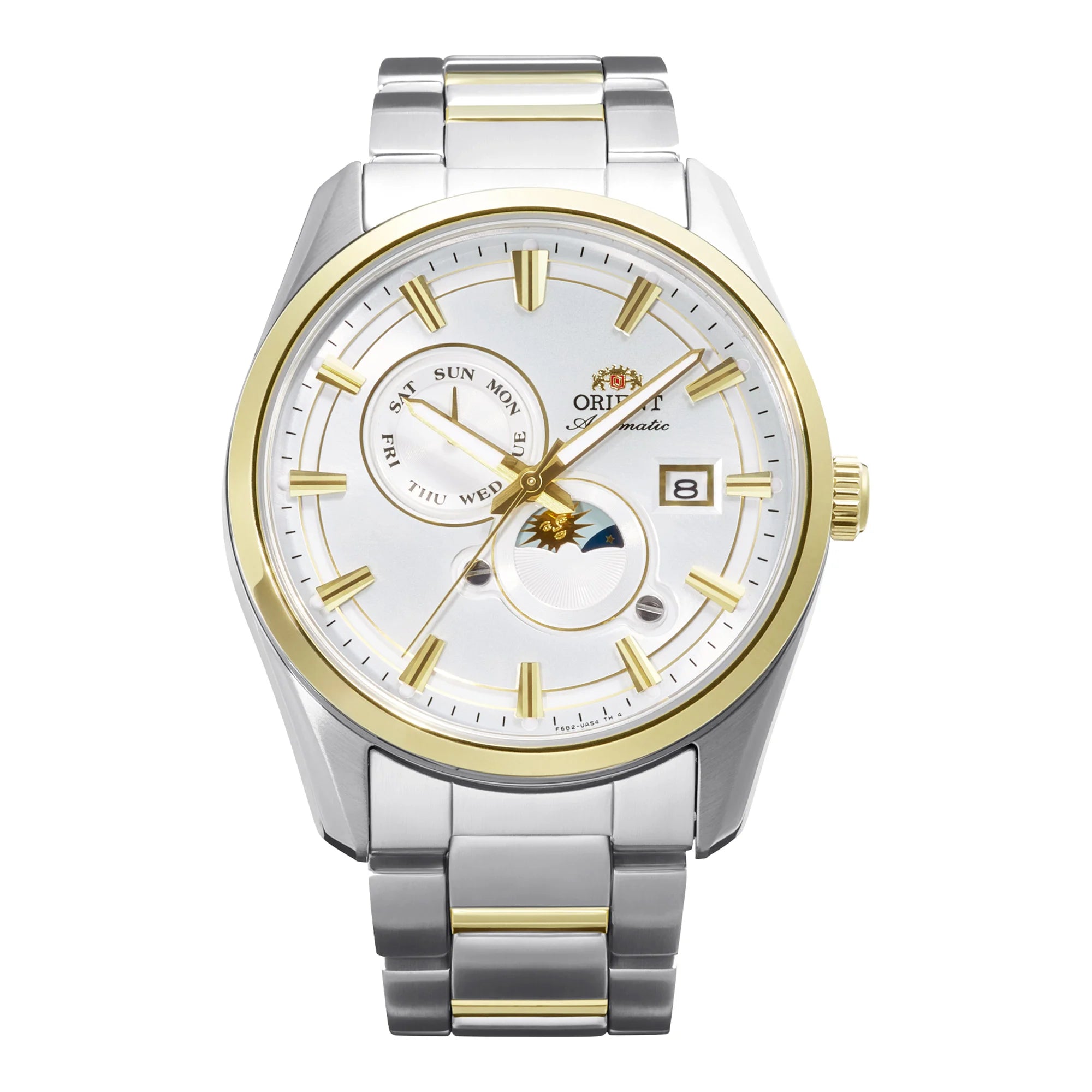 Discover the sophisticated Orient RA-AK0312S Stretto Day & Night automatic watch, a masterpiece of Japanese craftsmanship designed for the modern casual male. This elegant timepiece features a striking two-tone aesthetic, combining a silver-grey and yellow gold stainless steel case and bracelet with a pristine white dial.