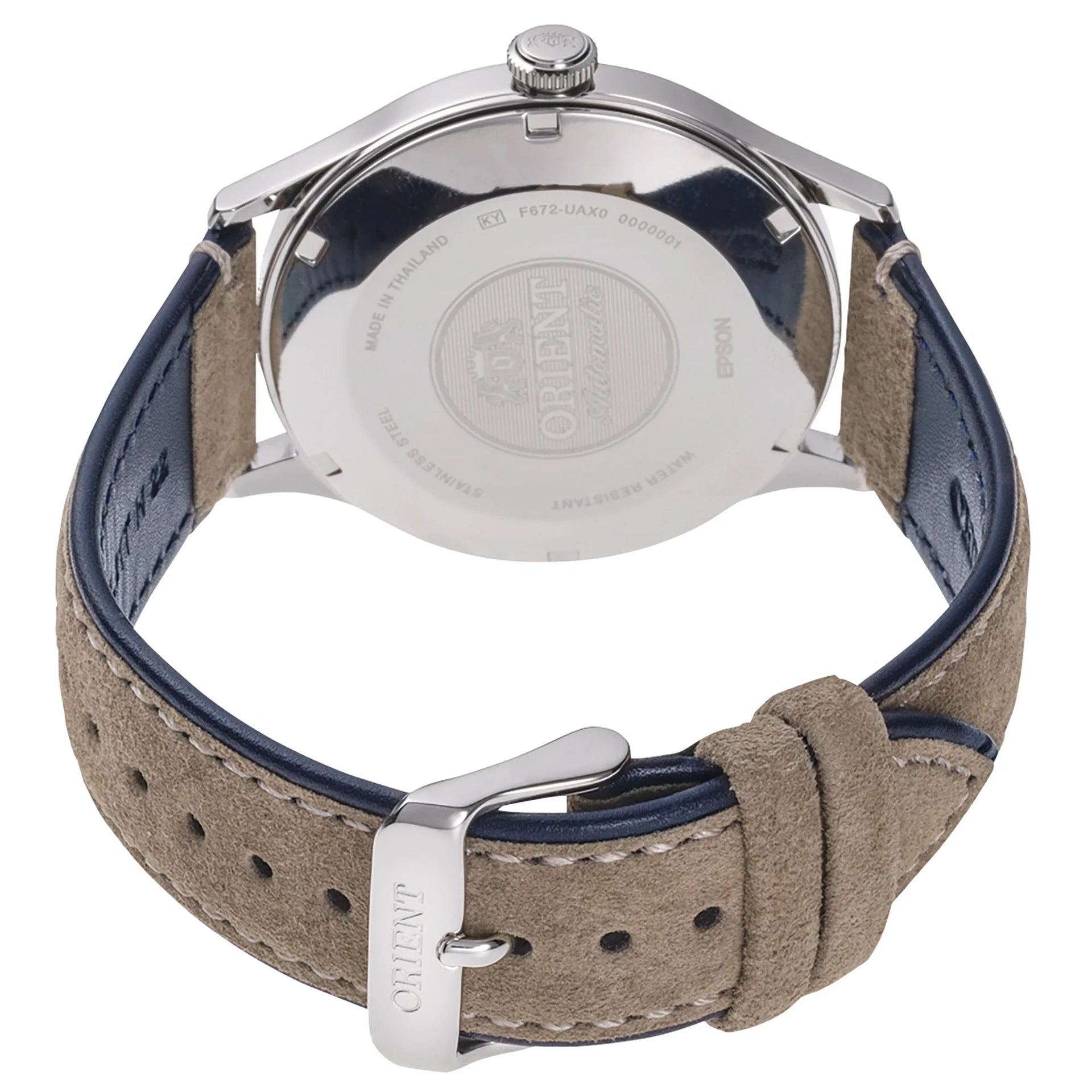 En el ámbito de la elegancia atemporal, el ORIENT AC0P Bambino V4 emerge como un faro de sofisticación y estilo. Elaborado con precisión, este reloj ORIENT Classic es un testimonio del arte de la relojería, diseñado para el hombre moderno que aprecia las cosas finas de la vida. Su caja redonda, bañada en un elegante tono gris plateado, mide un imponente diámetro de 42 mm, emanando una presencia refinada en la muñeca. El cristal mineral protege una hipnotizante esfera azul noche, que recuerda a un cielo estrellado, donde tres manecillas se deslizan con gracia sobre su superficie, marcando el paso del tiempo con una elegancia sin esfuerzo. La correa de cuero beige, asegurada con una hebilla de ardillón, añade un toque de elegancia casual, convirtiéndolo en el compañero perfecto para cualquier ocasión. Bajo su exquisito exterior se encuentra el corazón del reloj: un movimiento mecánico impulsado por el calibre F6724, que cuenta con 22 joyas y ofrece capacidades tanto de cuerda manual como automática. Con una precisión diaria de +25/-15, esta pieza garantiza exactitud en cada momento. La función de calendario de fecha añade practicidad a su atractivo, mientras que la corona de tirar y empujar permite ajustes fáciles. Resistente al agua, este reloj está listo para acompañarte en las aventuras de la vida, ya sea navegando por la jungla urbana o disfrutando de un día tranquilo junto al agua. El ORIENT AC0P Bambino V4 no es solo un reloj, es una declaración de gusto refinado y estilo atemporal, un verdadero compañero para el caballero exigente que valora tanto la forma como la función en su vida diaria.