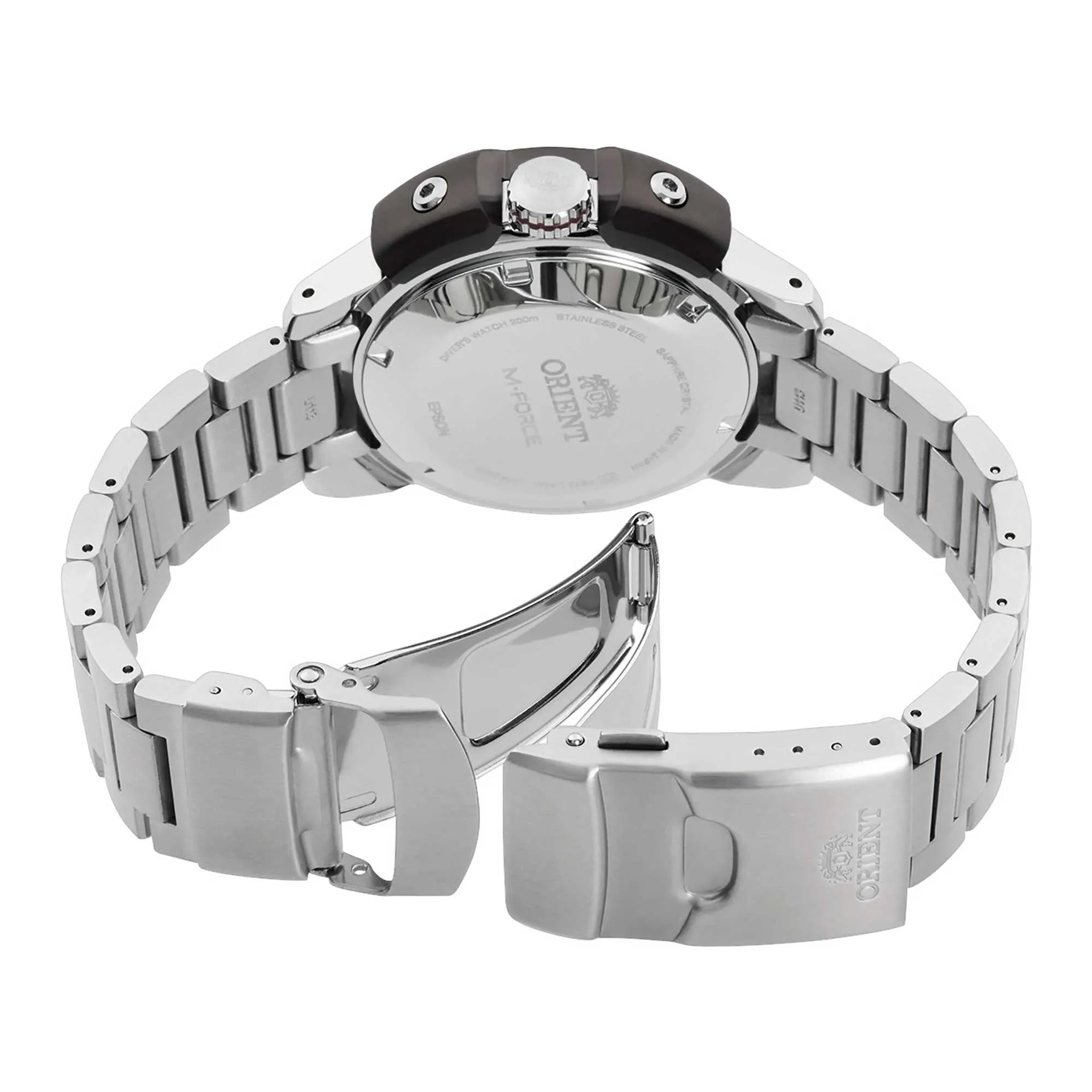 El ORIENT M-Force, diseñado para el espíritu aventurero, presenta una audaz esfera negra y una caja gris plateada. Con una resistencia al agua de 200 metros para buceadores y cristal de zafiro, este reloj es un testimonio del compromiso de ORIENT con la precisión y la durabilidad.
