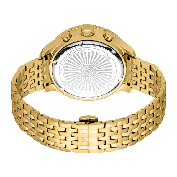Disfruta del resplandor dorado del reloj Roberto Cavalli Gent, donde una caja de oro amarillo y una esfera negra crean un contraste llamativo. La correa de acero inoxidable y el cierre desplegable de mariposa realzan su atractivo lujoso, mientras que la resistencia al agua hasta 100 metros garantiza una elegancia atemporal.