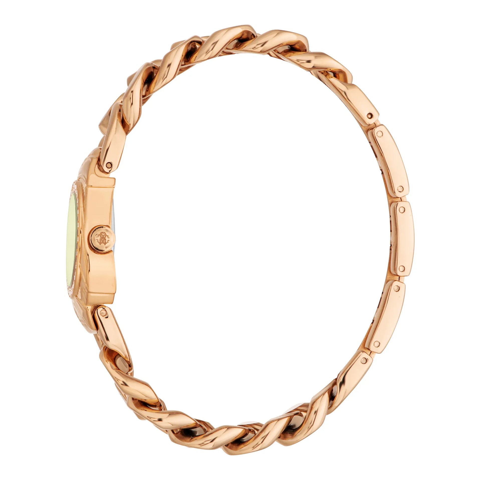 En el mundo de la moda, donde la elegancia se encuentra con la innovación, surge un reloj que captura la esencia de la sofisticación y la modernidad. Elaborado en el corazón de la relojería suiza, este reloj Roberto Cavalli Lady es un testimonio de diseño refinado y artesanía exquisita. Su forma irregular de caja, bañada en el cálido resplandor del oro rosa, emana un sentido de feminidad audaz, convirtiéndolo en un accesorio perfecto para la mujer contemporánea que se atreve a destacar. La esfera verde oliva, un sutil guiño a la tranquilidad de la naturaleza, contrasta elegantemente con la correa de acero inoxidable en oro rosa, creando una mezcla armoniosa de colores que es a la vez llamativa y serena. Con una resistencia al agua de hasta 50 metros, este reloj no solo es una declaración de moda, sino también un compañero confiable para las aventuras de la vida. El cristal mineral protege la esfera, asegurando claridad y durabilidad, mientras que la corona de tipo pull & push ofrece facilidad de ajuste. El cierre de joyería añade un toque de lujo, asegurando el reloj con gracia y estilo. Impulsado por un movimiento de cuarzo preciso y con una visualización de dos manecillas con el calibre GL22, este reloj es una celebración tanto de la forma como de la función. Ya sea usado en un evento glamoroso o en una salida casual, este reloj Roberto Cavalli Lady es un símbolo de elegancia atemporal y atractivo moderno, capturando el espíritu de quienes abrazan los momentos de la vida con aplomo y confianza.